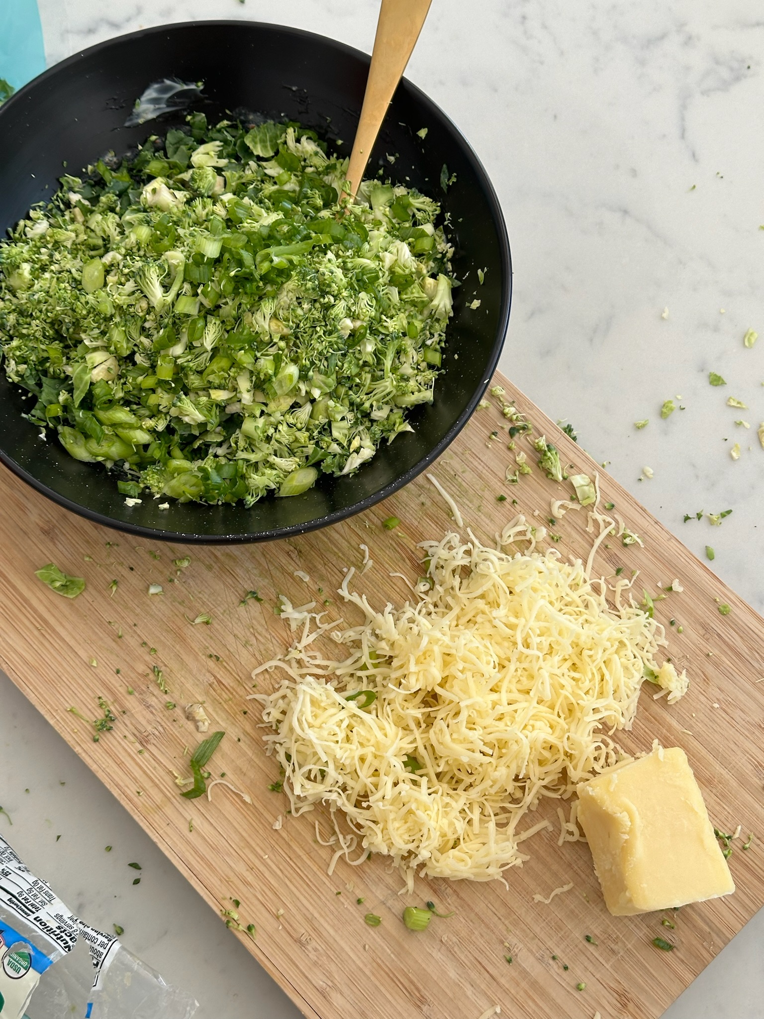 In a large bowl, combine the chopped kale, Brussels sprouts, diced broccoli, and green onion.