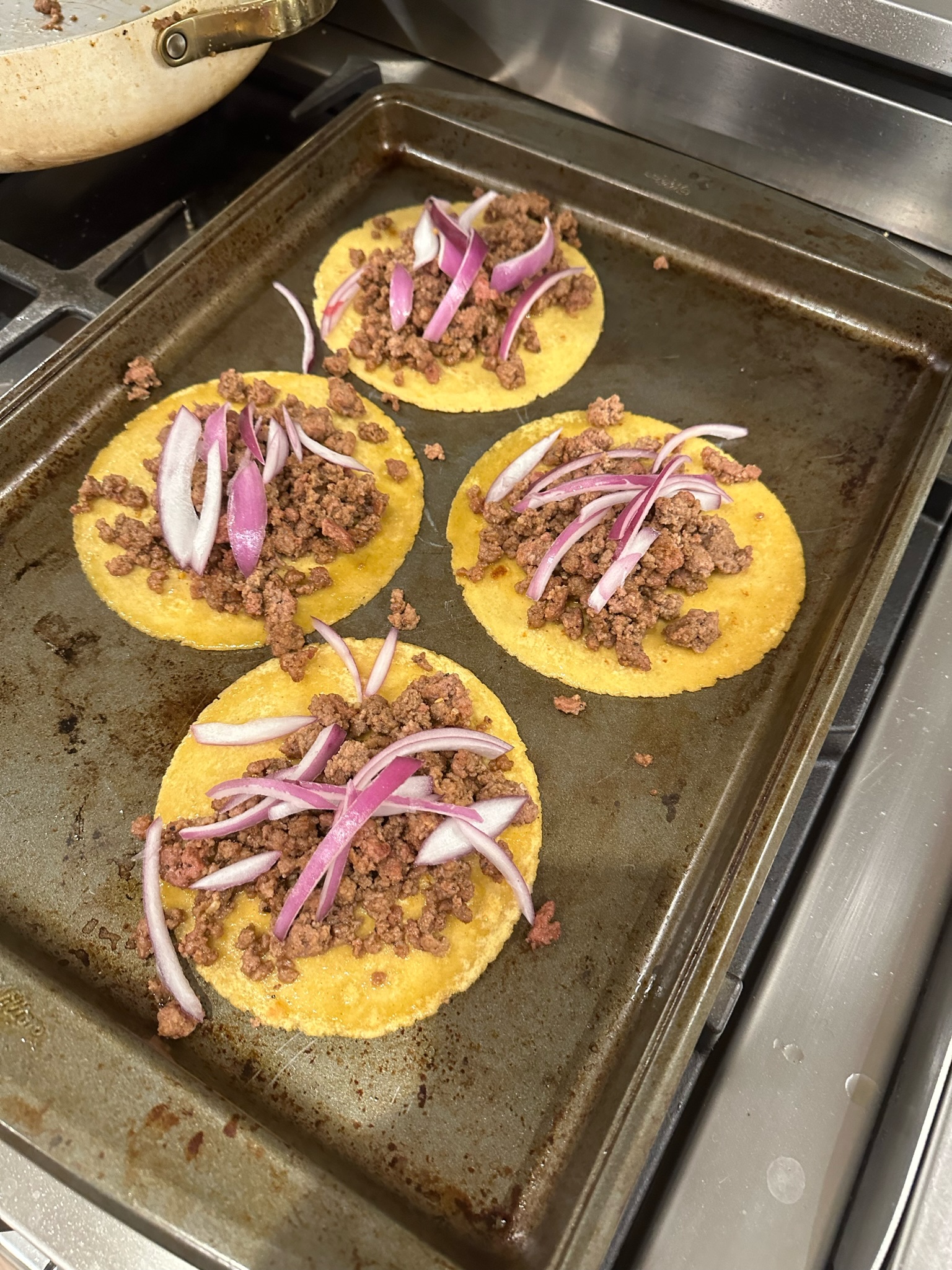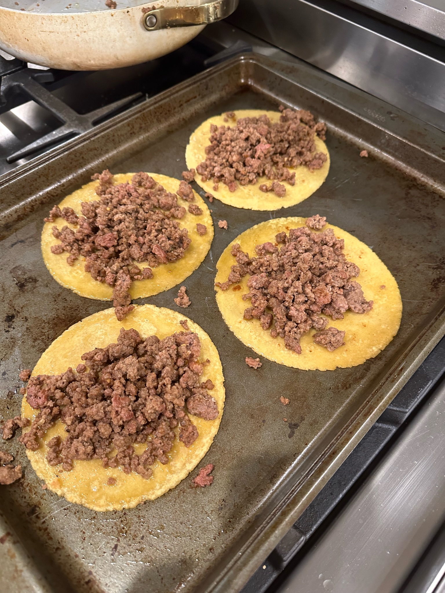 Put the tortillas covered with a little bit of olive oil on a baking tray, and add a little bit of your cooked ground beef to each tortilla.