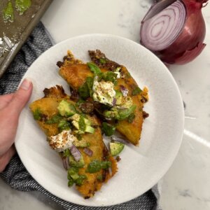 Add your red onion and cheese! Fold over and place in the oven. (I used the sides of the baking tray to keep the tacos folded since they were filled pretty full!) Add to the oven for 2-3 minutes on each side to ensure that your tacos are nice and crispy!