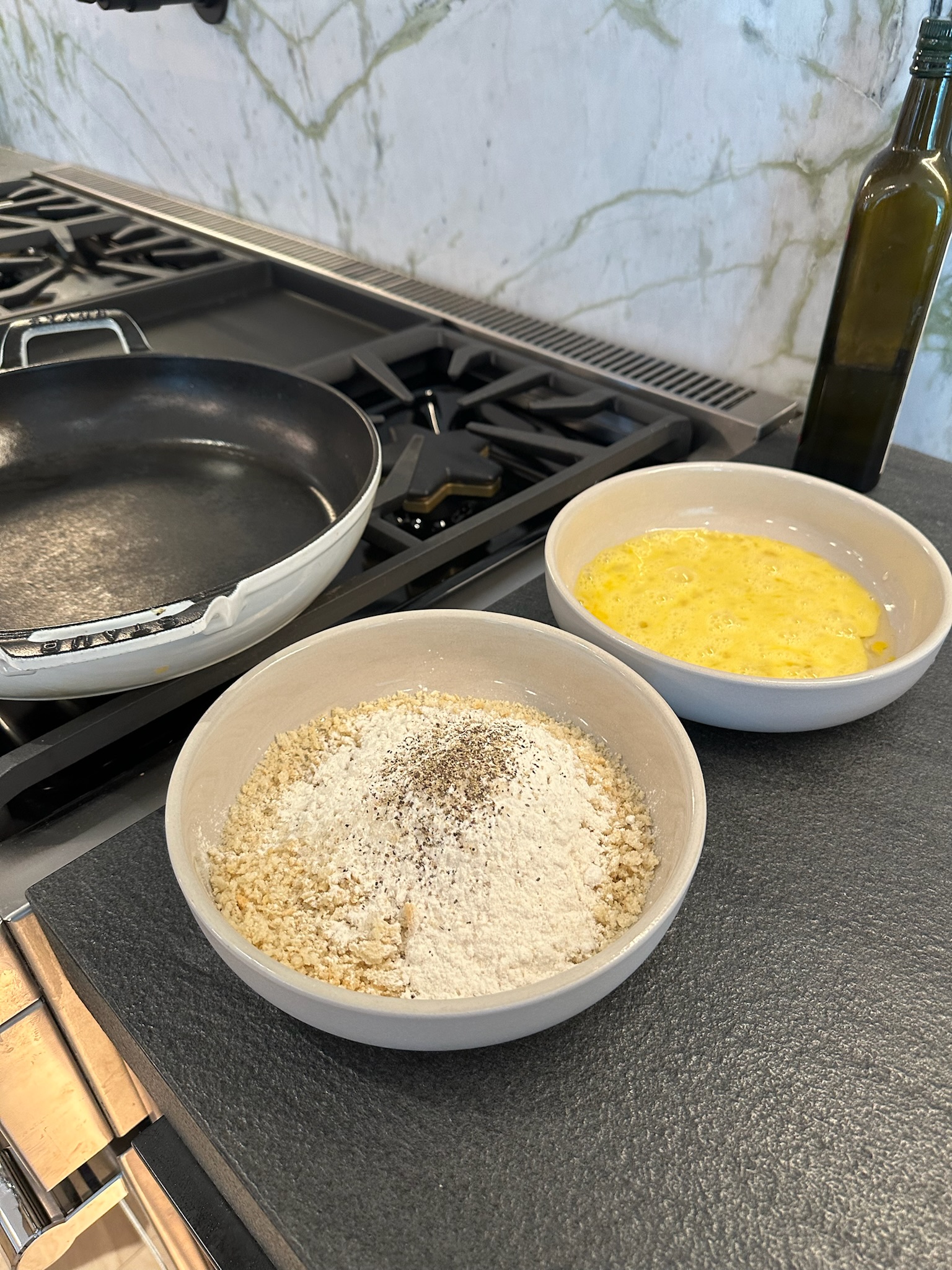 Dip the chicken cutlets in the egg wash, then coat them in a panko/flour mix seasoned with salt + pepper.