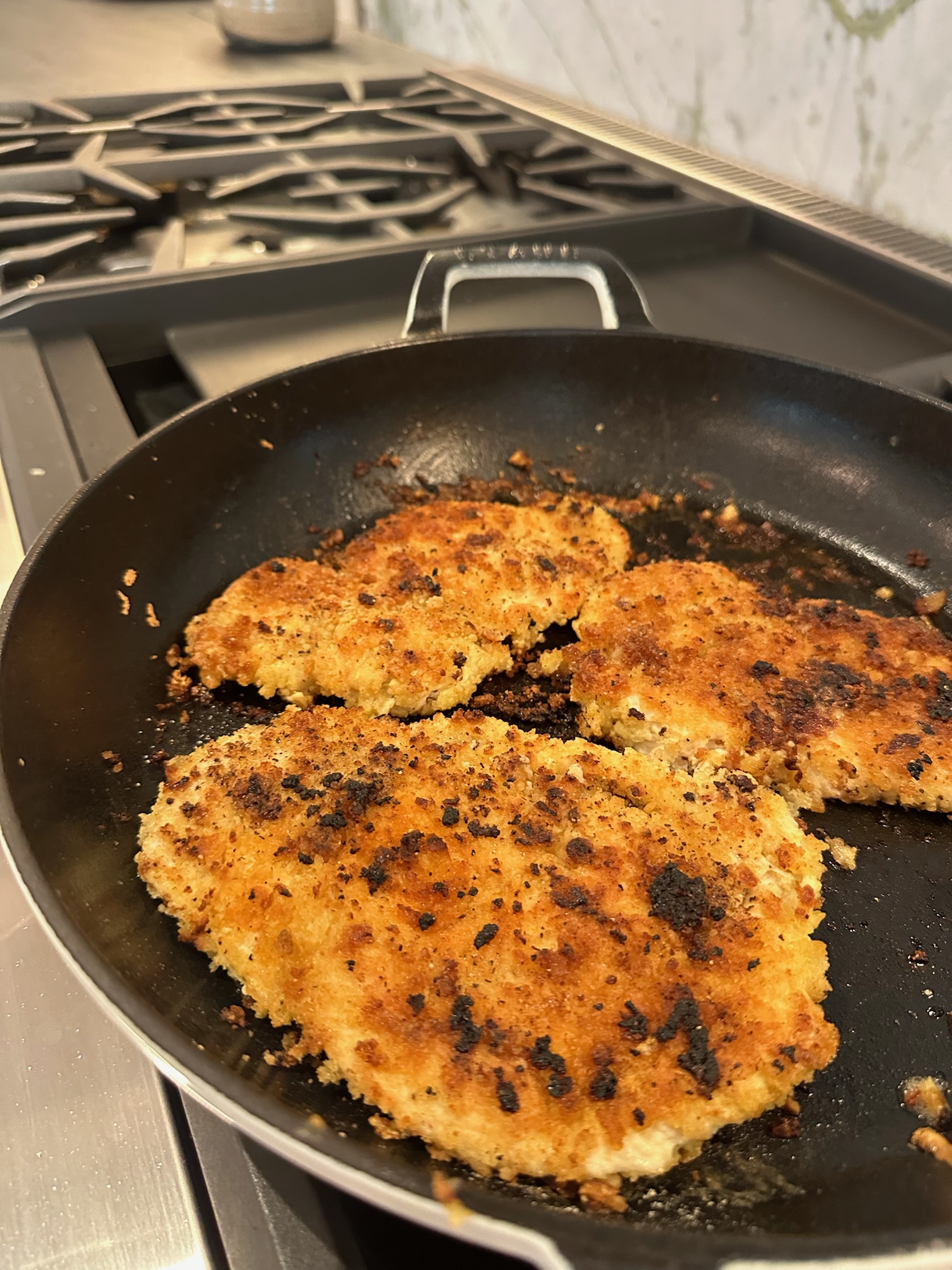 Fry the cutlets for about 5 minutes per side until golden. Lower the heat and cook for a few more minutes on each side to make sure the chicken’s fully cooked and crispy.