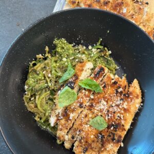 Plate your chicken over the pesto zoodles, sprinkle with Parm and basil, and enjoyyy!