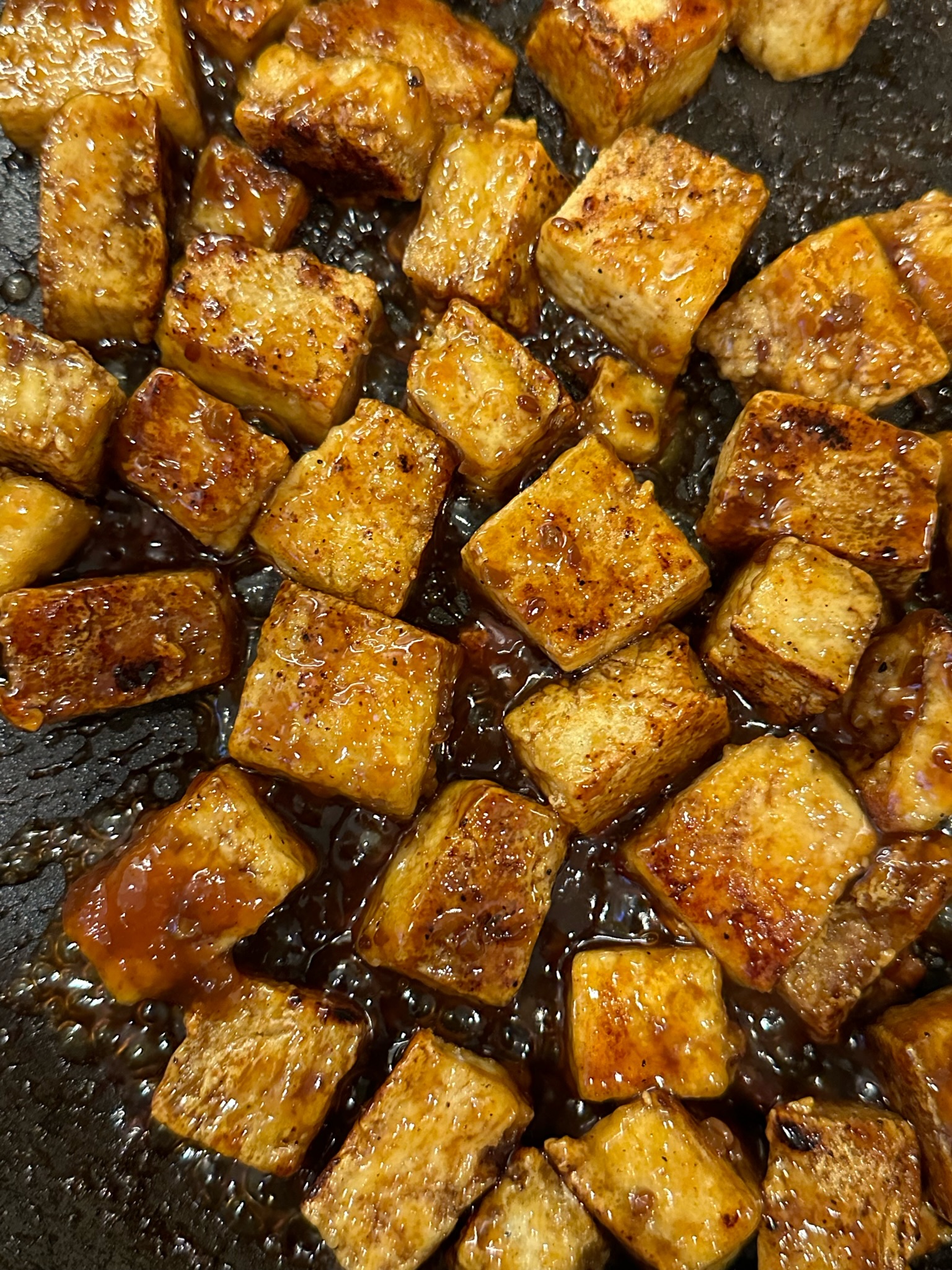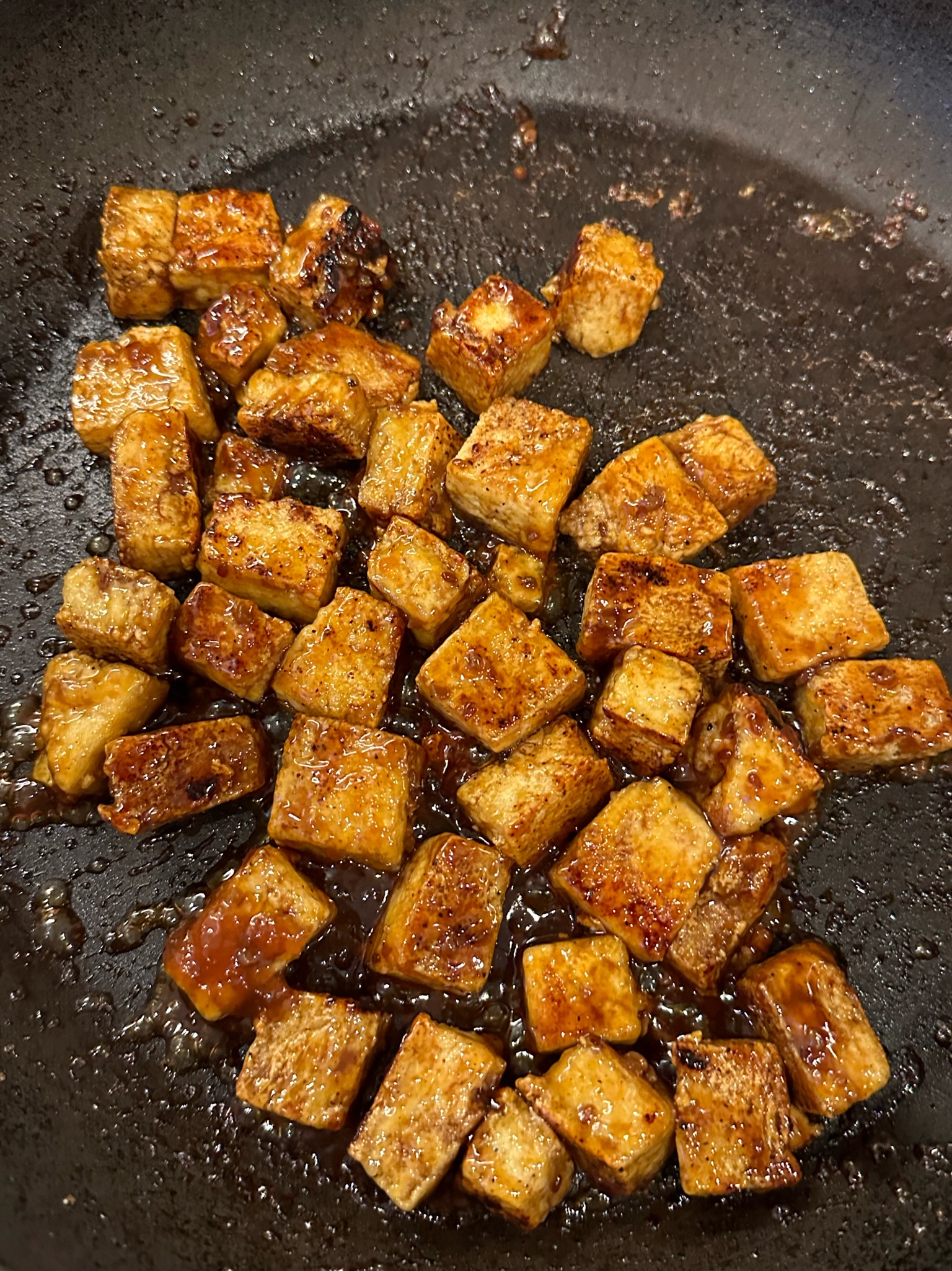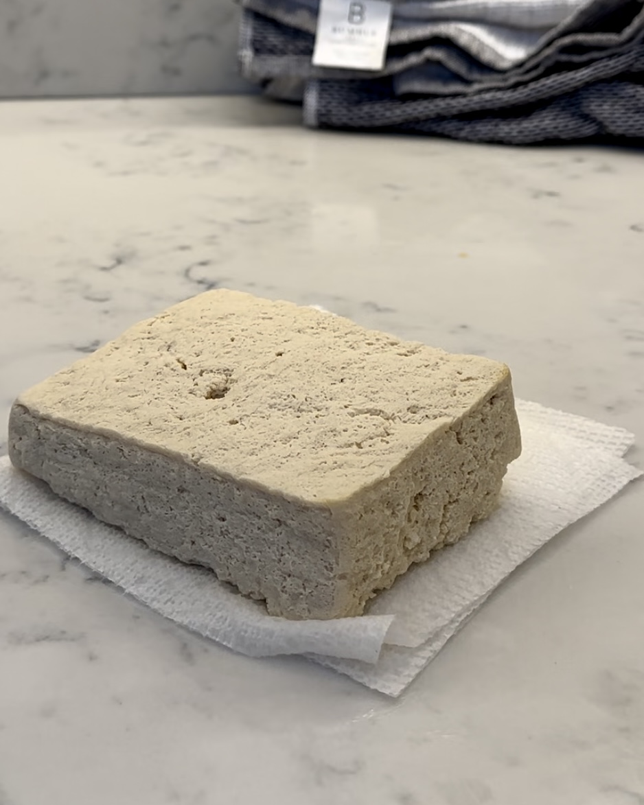 Drain the water from the tofu packaging and wrap the tofu in paper towels. Place a weight on top to press out excess water for 15-30 min – I personally used books, but you can use plates, pots, etc.Optional Step: For extra crispiness, freeze the tofu for 1 hour, then thaw before cutting. This step is optional but enhances the crispiness of the tofu.