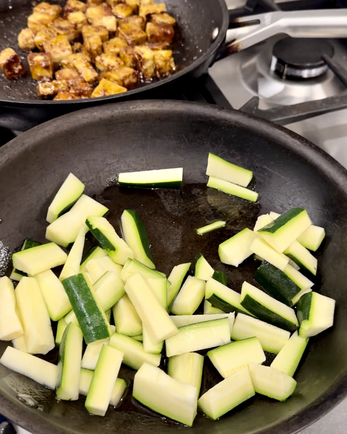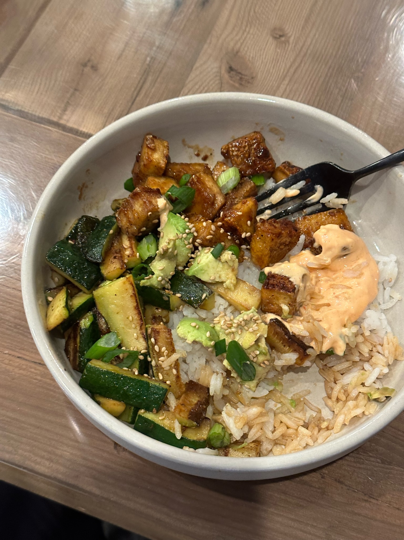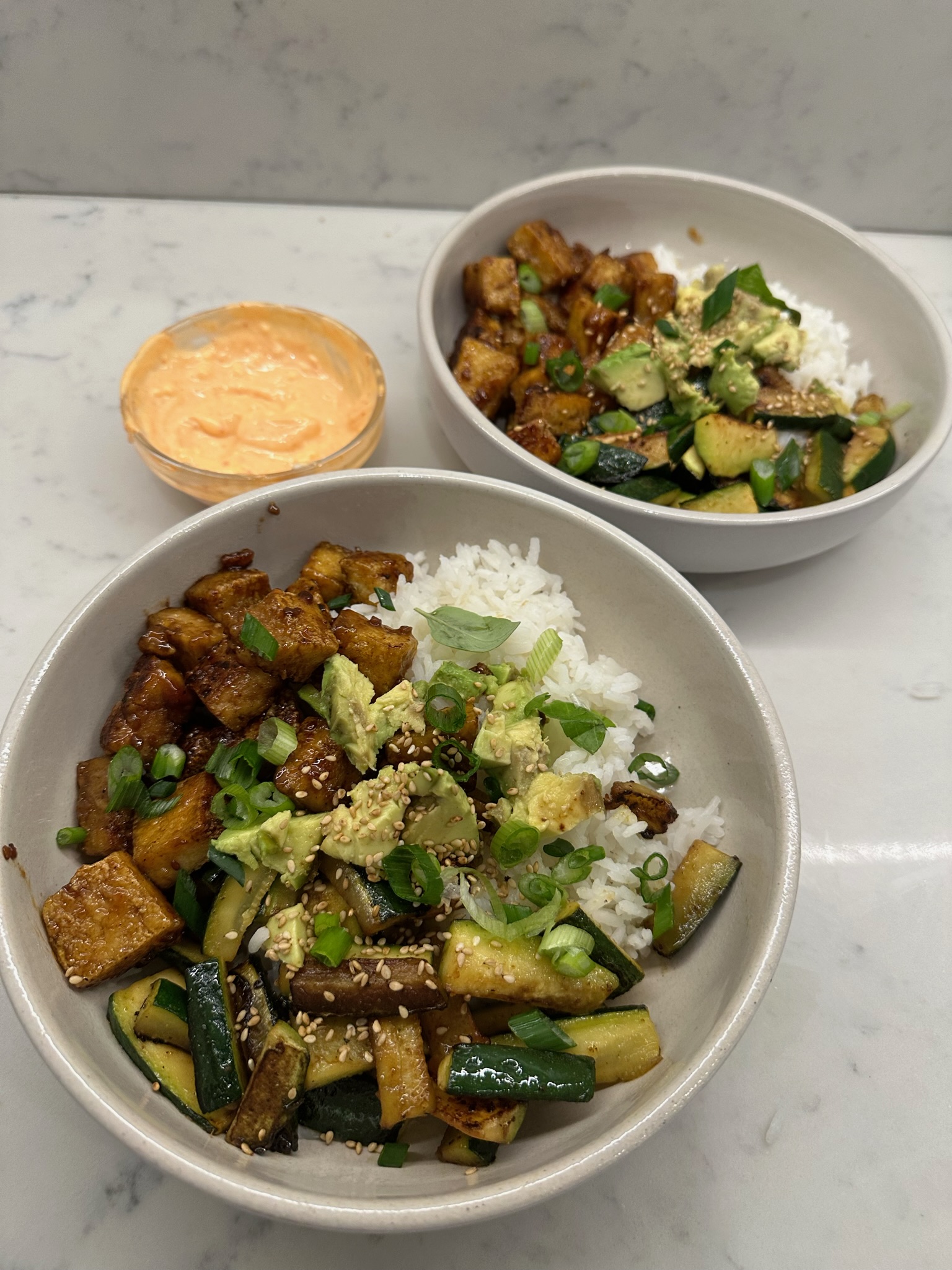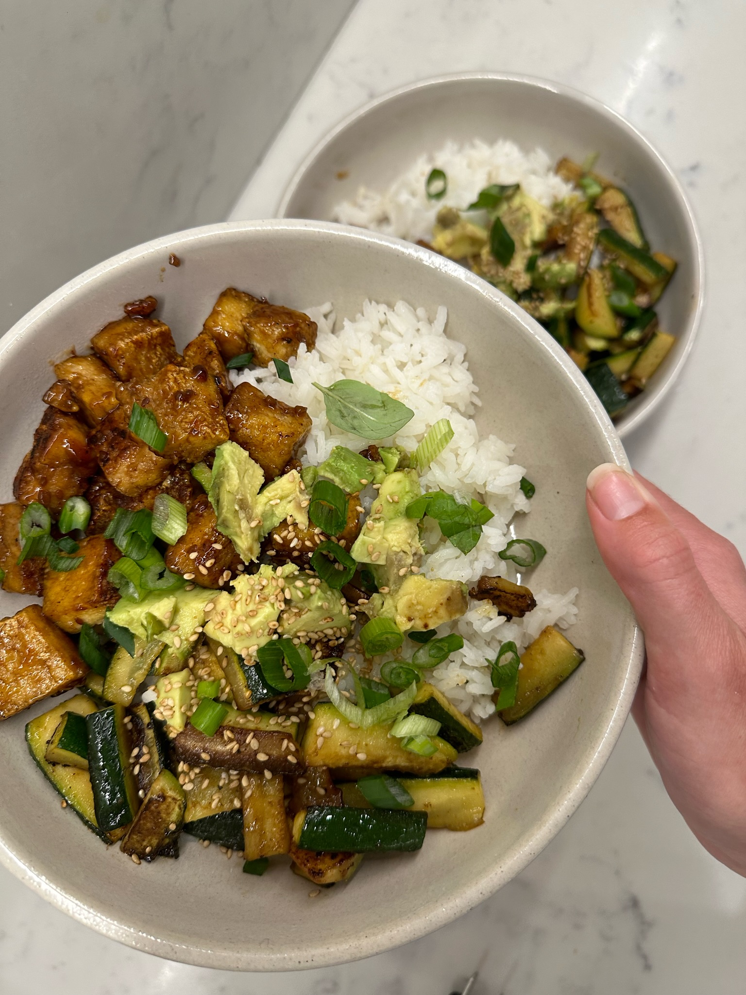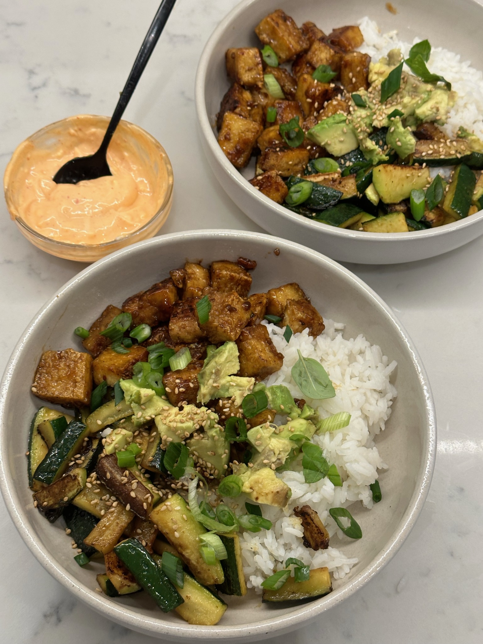 Assemble your bowl by placing rice as the base and layering the tofu and zucchinis on top. Sprinkle with sesame seeds, diced green onions, and avocado.