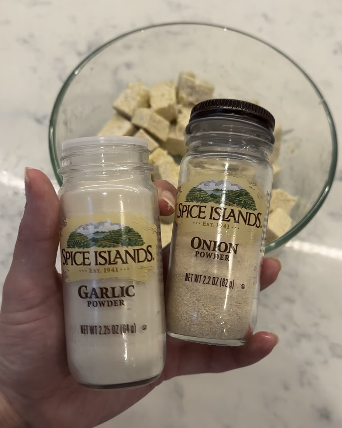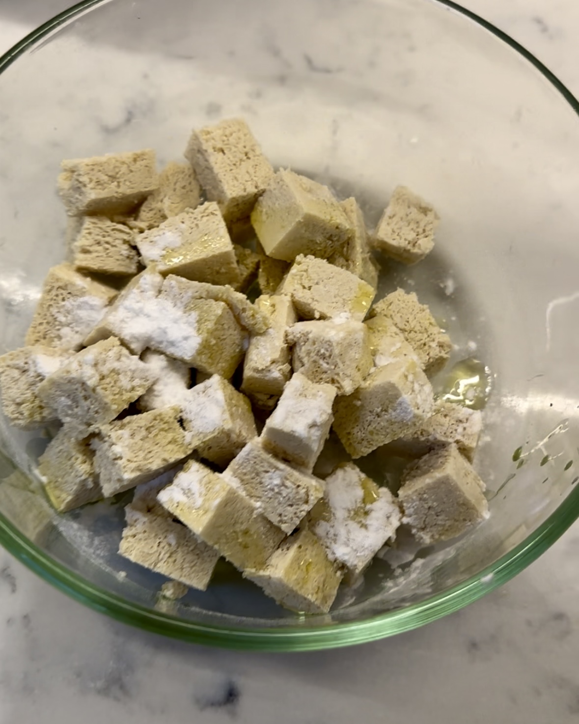 Cut the tofu into cubes and place them in a bowl with a little oil and starch to help crisp the edges. Season with onion powder and garlic powder, and mix to coat evenly.