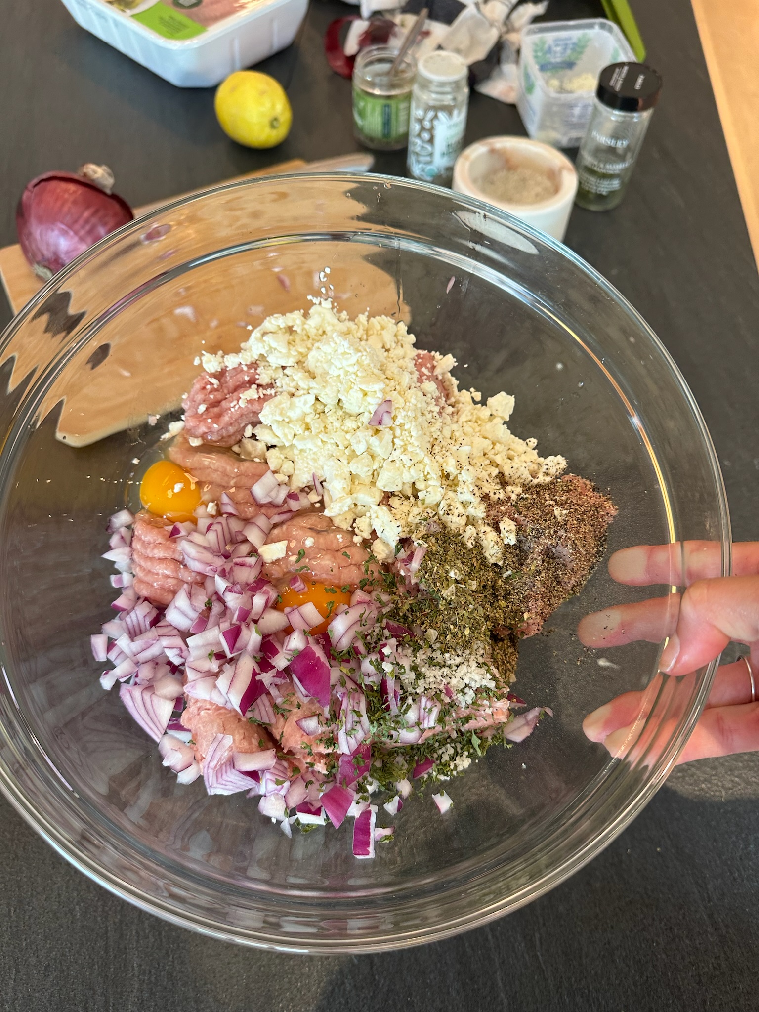In a large bowl, combine the ground turkey, 2 large eggs, diced red onion, crumbled feta, Mediterranean seasoning, lemon juice, salt, pepper and dried parsley.
