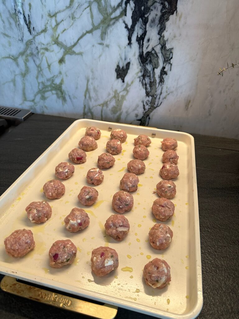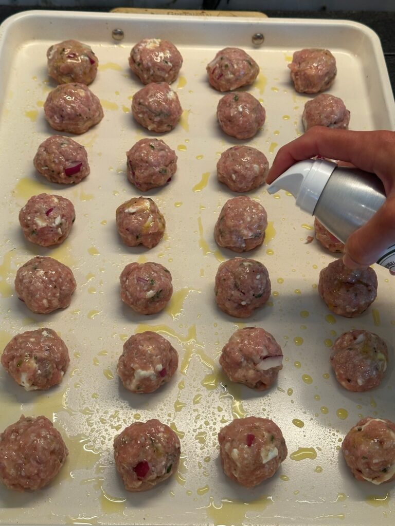 Roll mixture into meatballs, about 1.5 inches in diameter, and place them evenly on the prepared baking sheet.