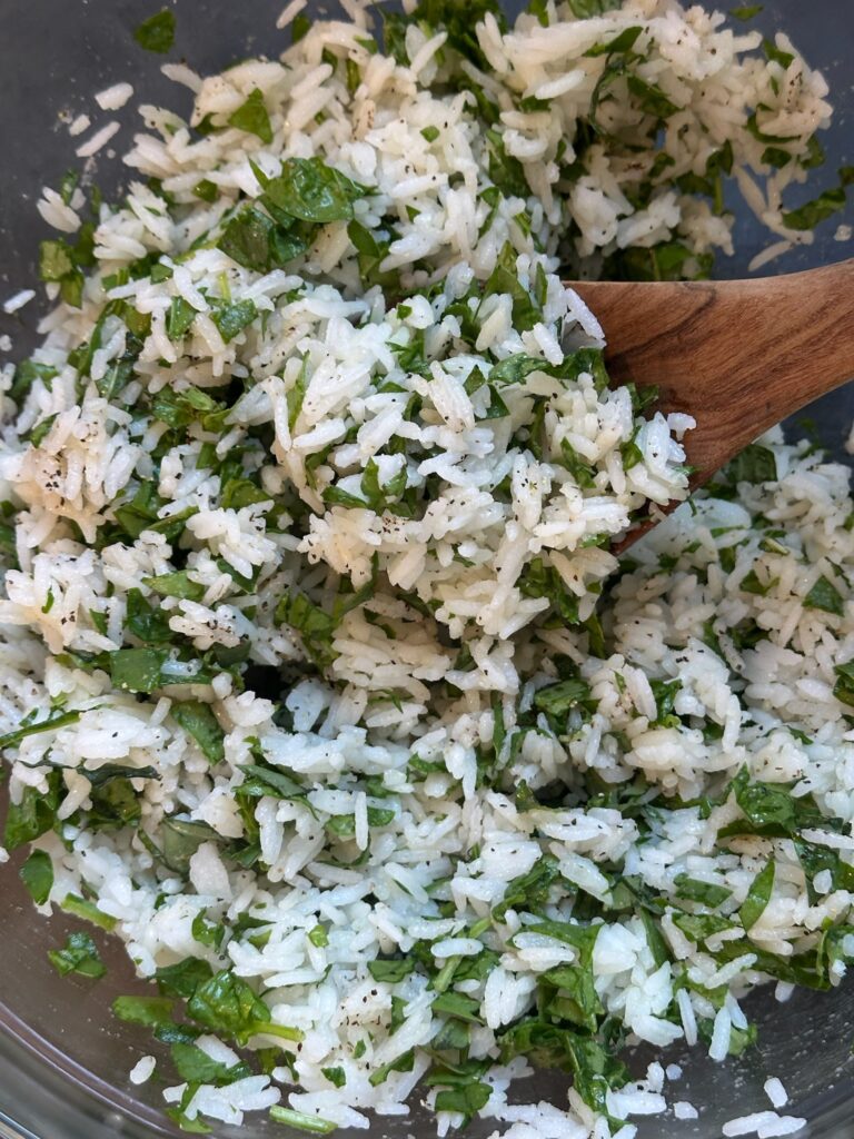After the rice is cooked, set it in a large bowl and add the butter, spinach, basil and seasonings.