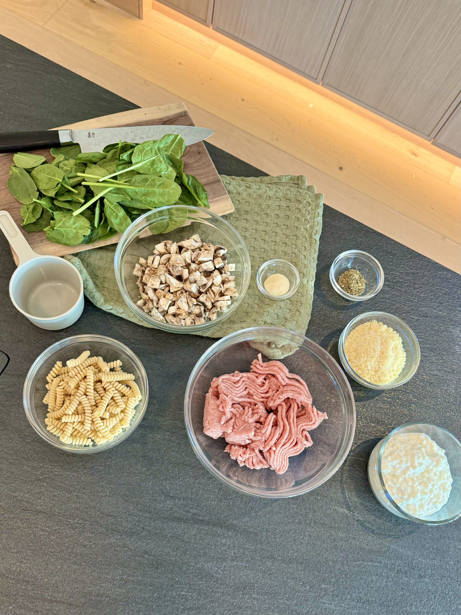 Prep your veggies by removing the stems and chopping the spinach and dicing the mushrooms.