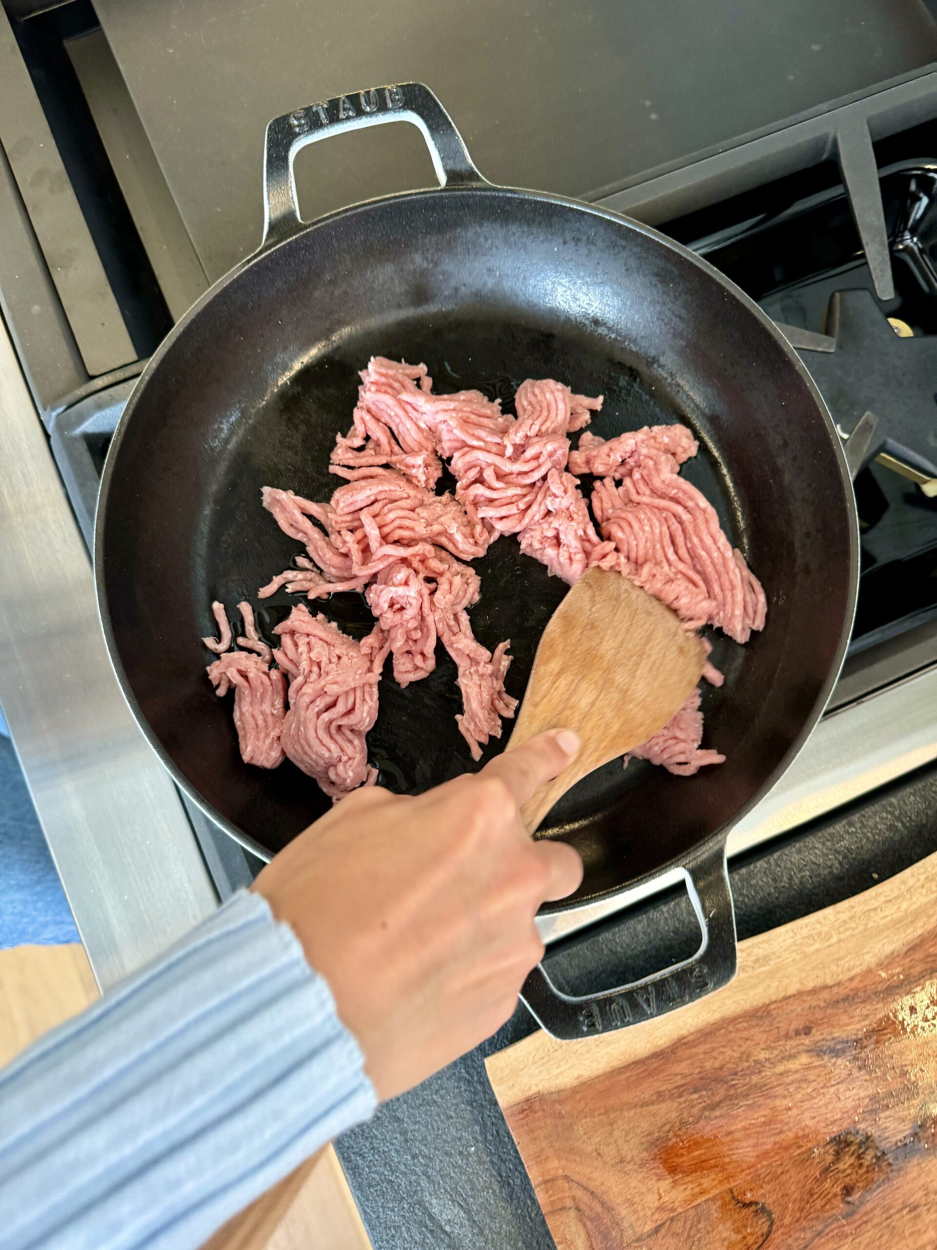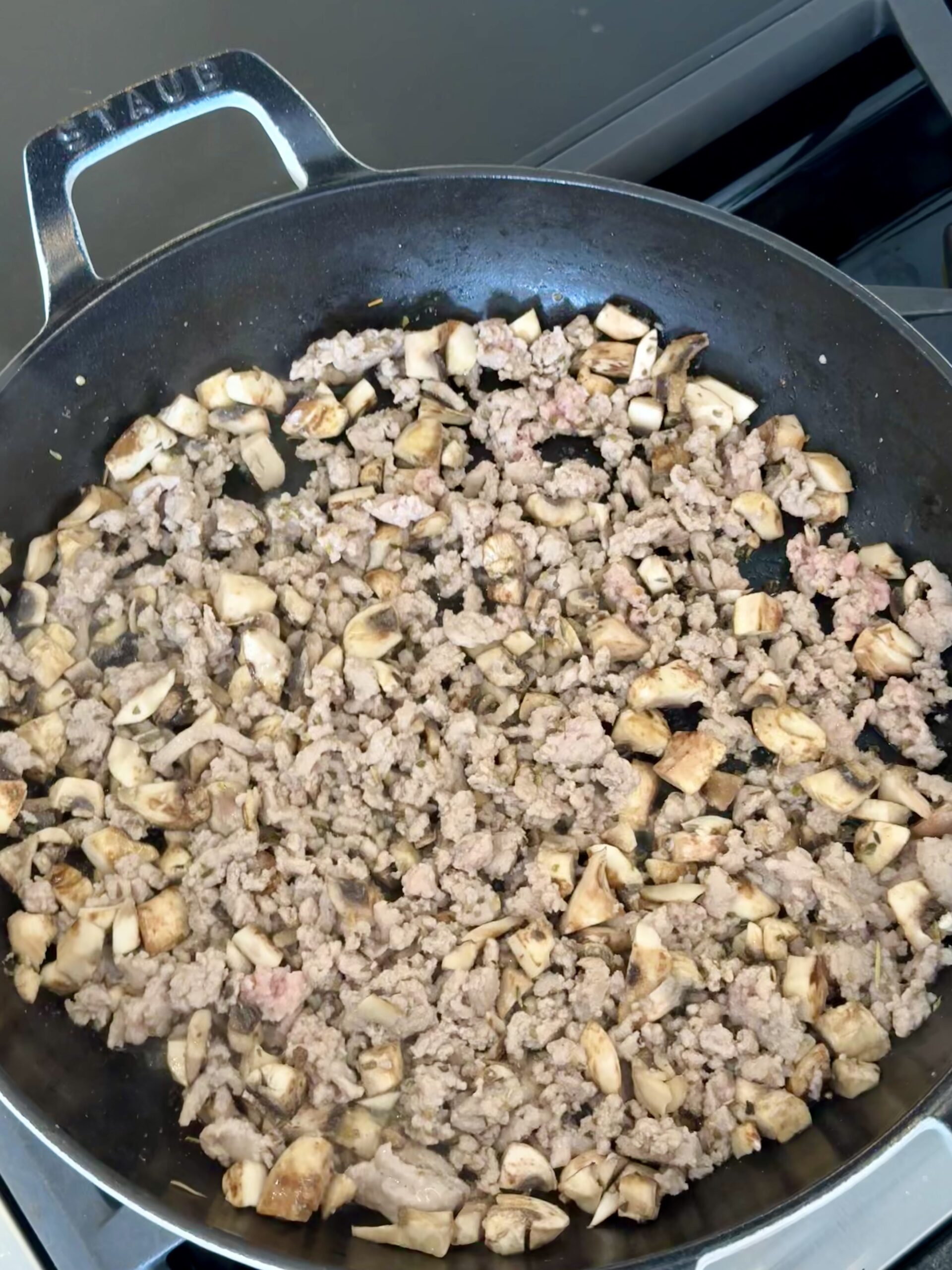 In a large skillet (with height and depth), add the ground turkey or sausage. Sauté over medium heat for 7-9 minutes until browned and cooked through.