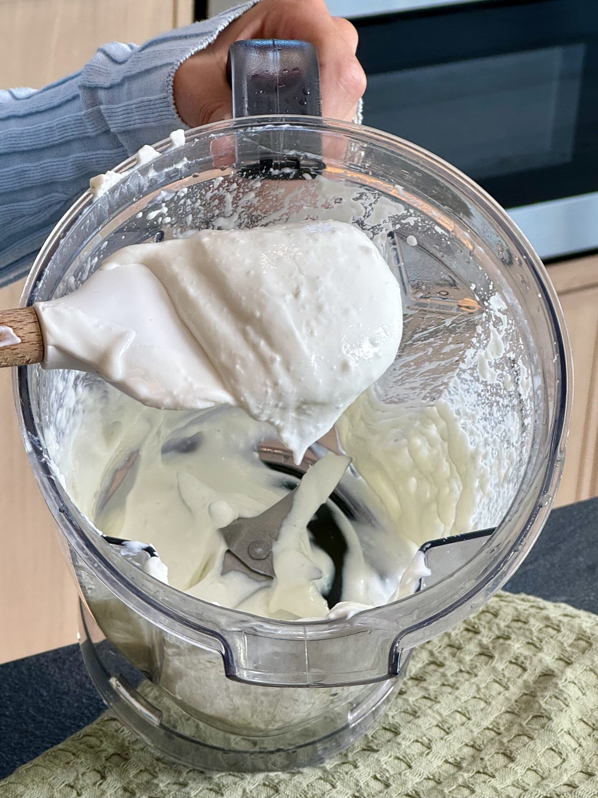 While the pasta is cooking, blend the cottage cheese with a splash of water (about 3 tablespoons) until smooth, resembling a creamy Alfredo sauce.