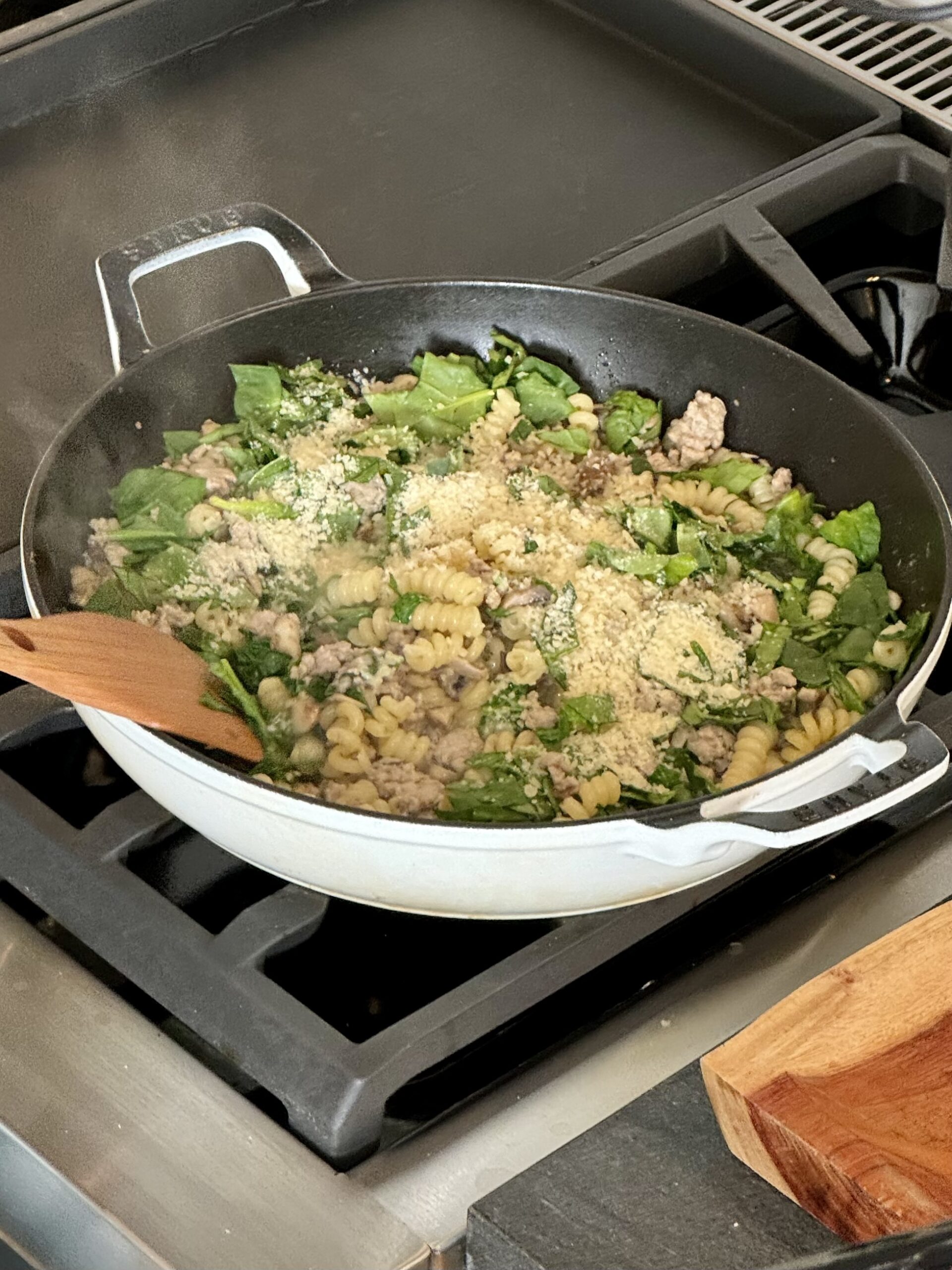 Add the uncooked pasta and water/broth (2.5 cups if using a lid, 3 cups if not), and if using a lid, cover the your skillet. Regardless if you’re using a lid or not, reduce heat to low to medium. Cook for about 6-7 minutes, stirring halfway through.