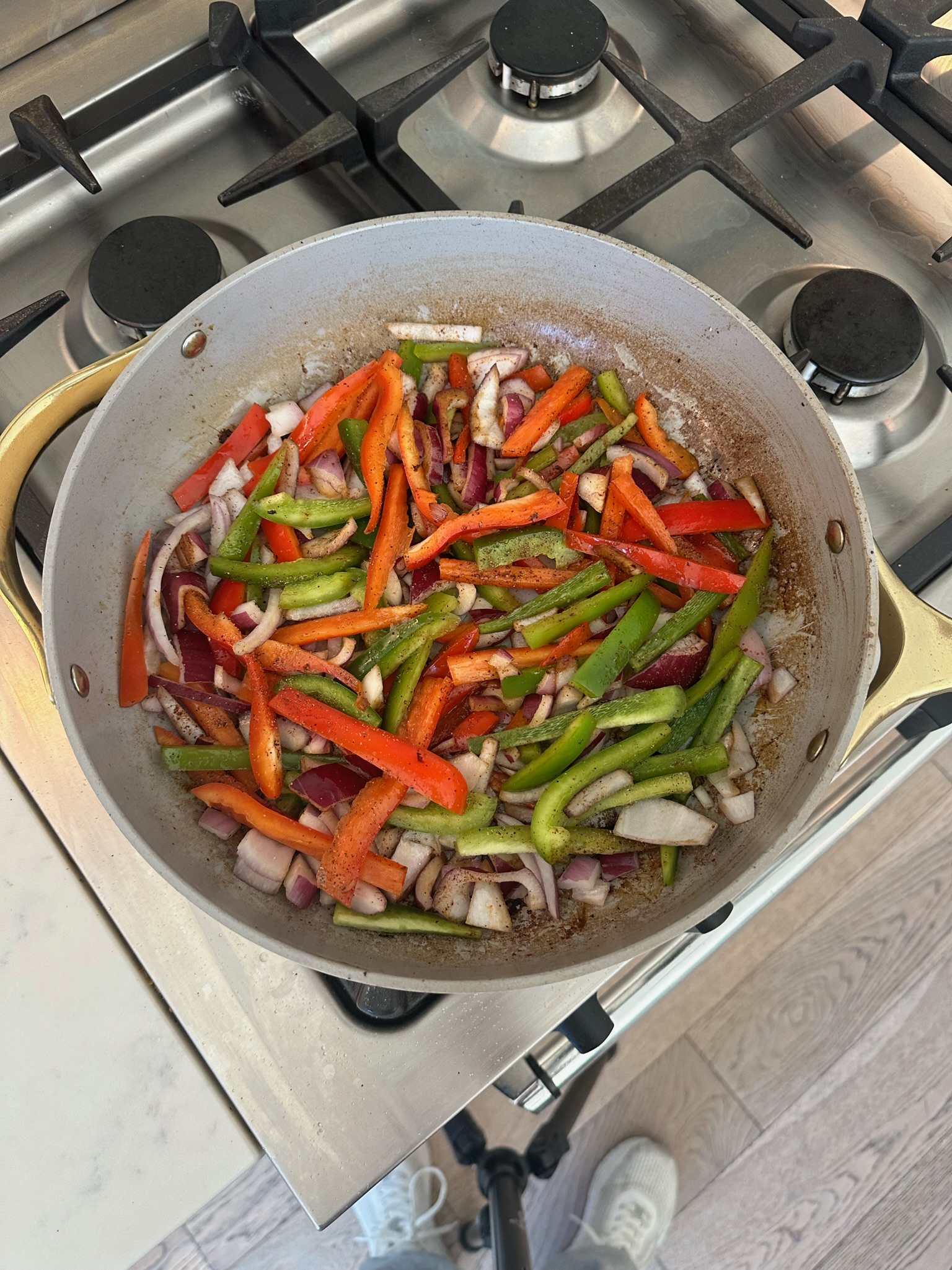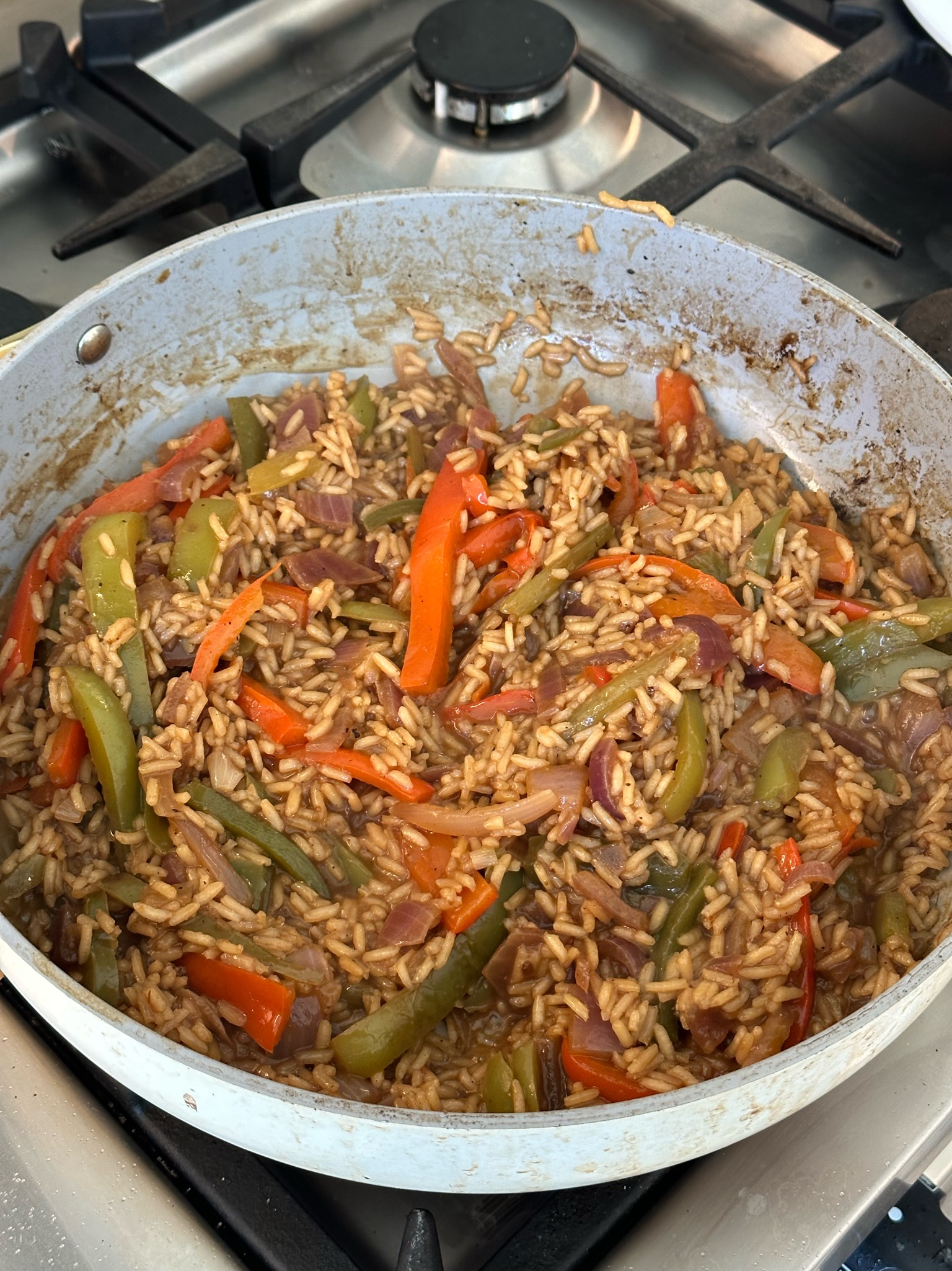 Add your diced onion and sliced bell peppers to the same skillet—season with the remaining fajita seasoning, garlic powder, chili powder, salt, and pepper. Cover with the lid and let simmer till rice is cooked through.