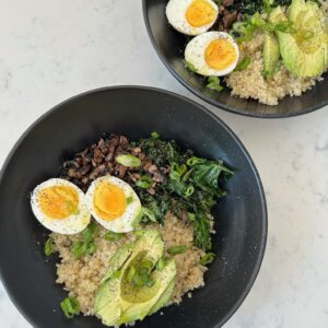 Start with quinoa as the base. Layer the sautéed kale and mushrooms on top. Slice the boiled egg and add it to the bowl.