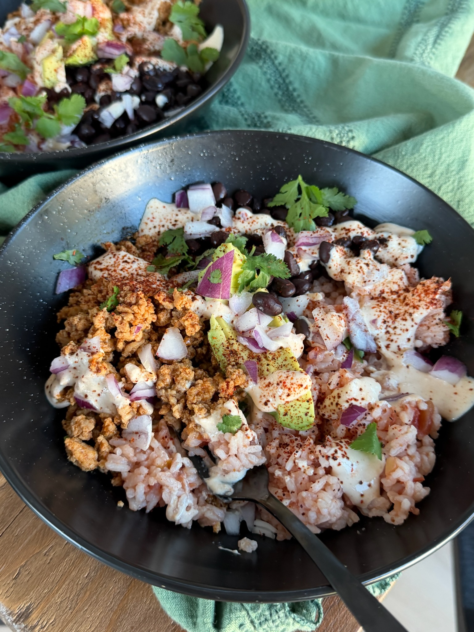 Top with sliced avocado and garnish with green onions.