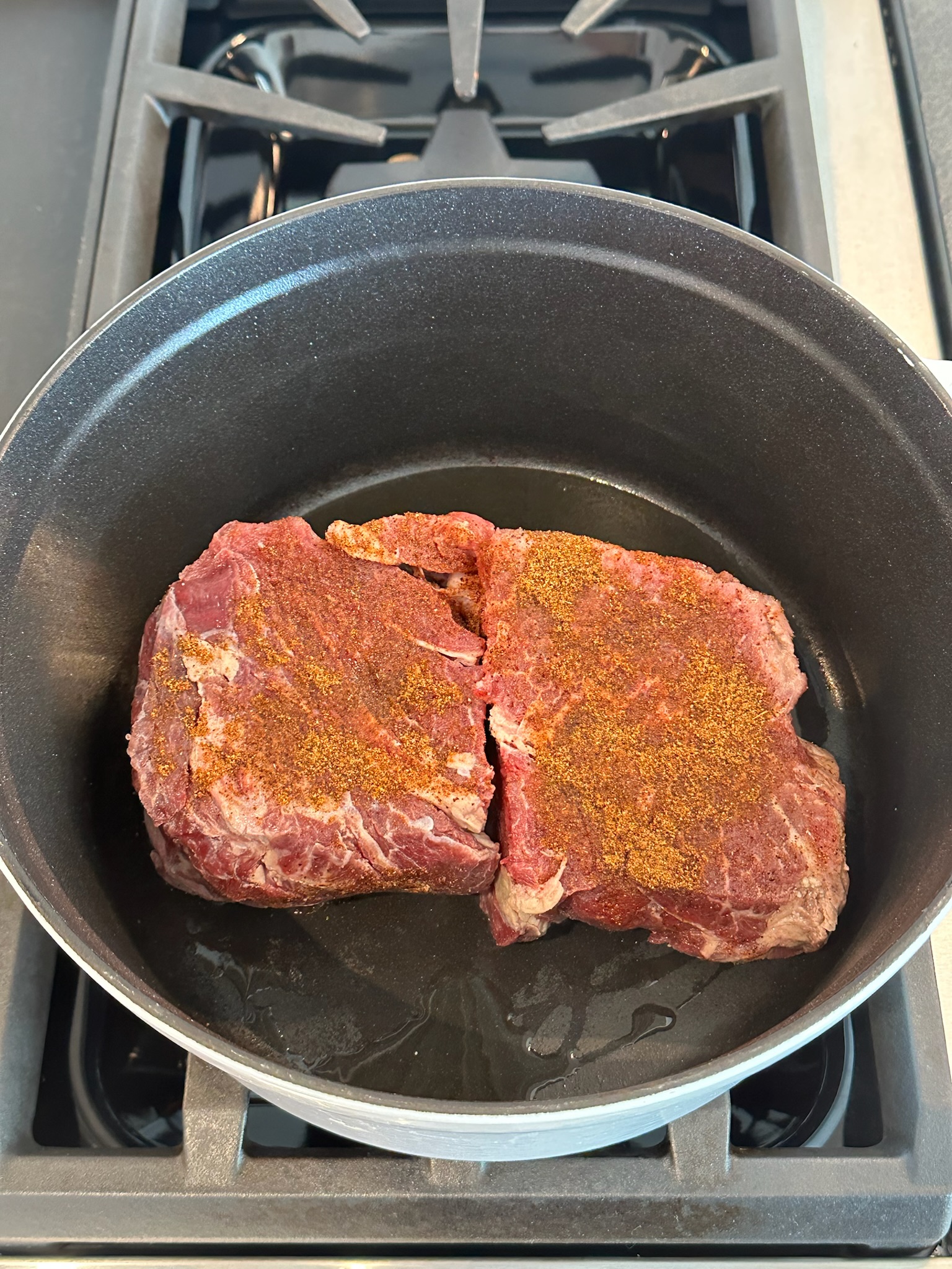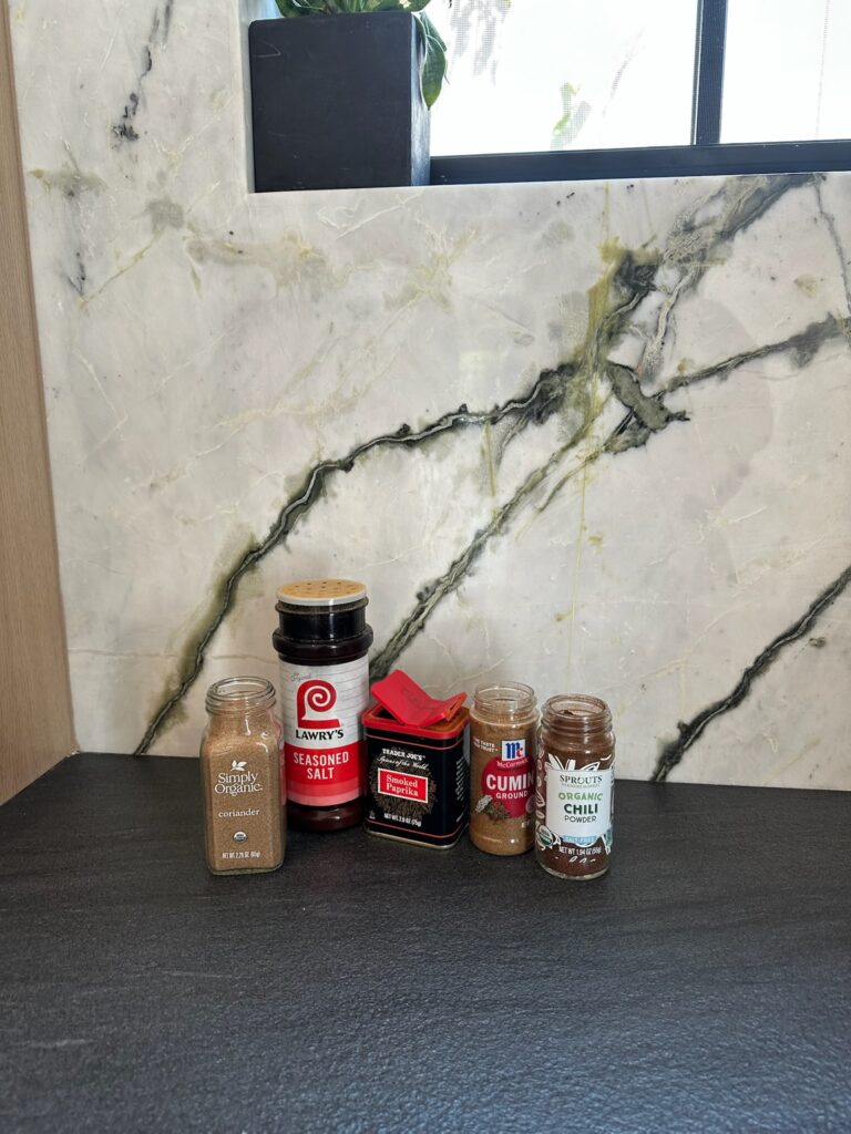 Pat the chuck roast dry with paper towels. In a small bowl, mix together chili powder, coriander, paprika, Lawry’s, and cumin. Rub the spice mix all over the beef until fully coated.