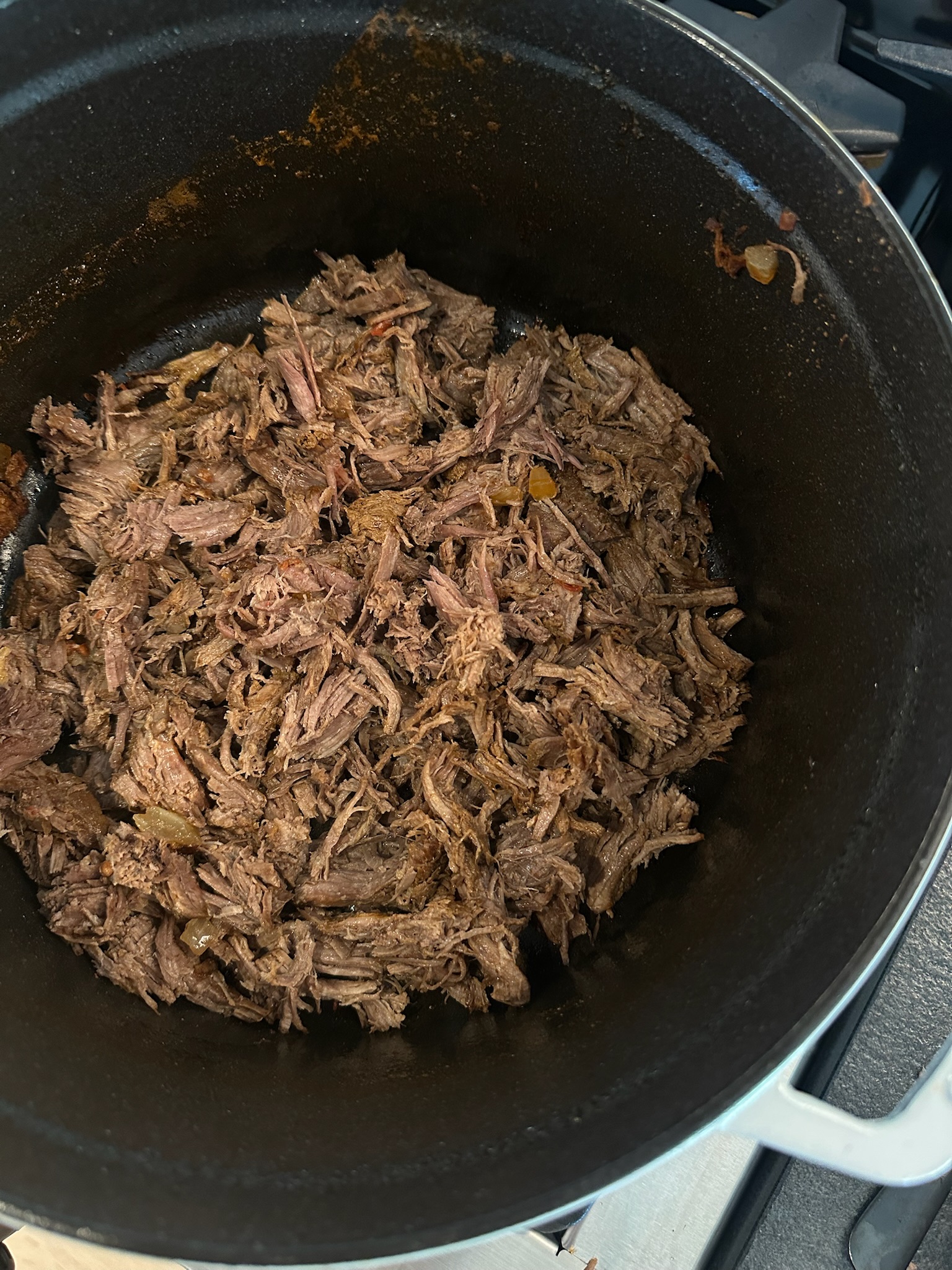 Once cooked, remove the roast and shred it using two forks (it should shred easily). Return the shredded meat to the pot without the liquid to let it is crisp a little bit. Add back in the liquid (3-4 cups).