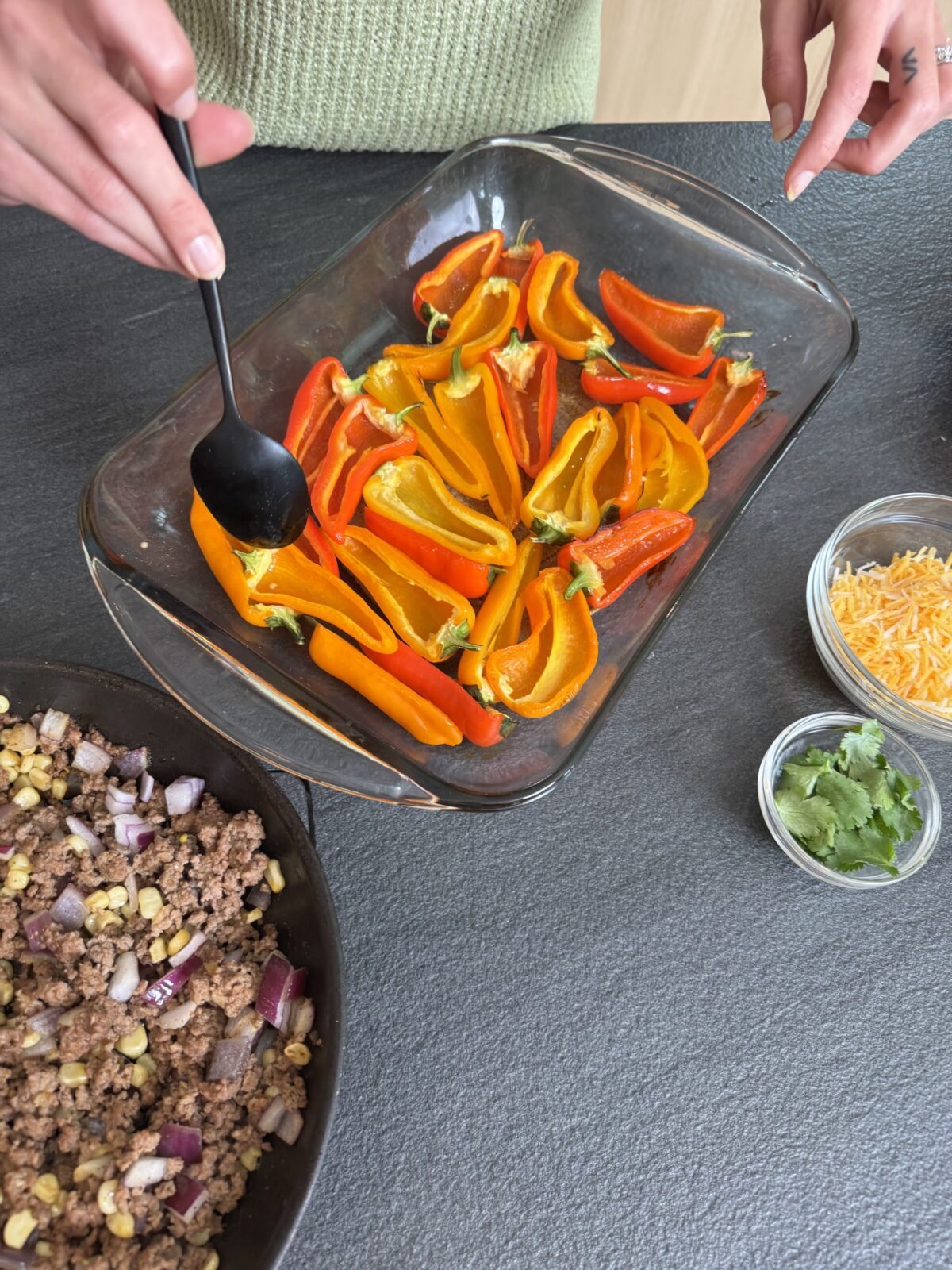 While the peppers bake, heat a skillet over medium heat. Add the ground beef and cook until browned and fully cooked through, breaking it up with a spoon. Once cooked, stir in the diced red onion, white corn, and taco seasoning. Cook for an additional 2-3 minutes, allowing the flavors to combine. Remove from heat.