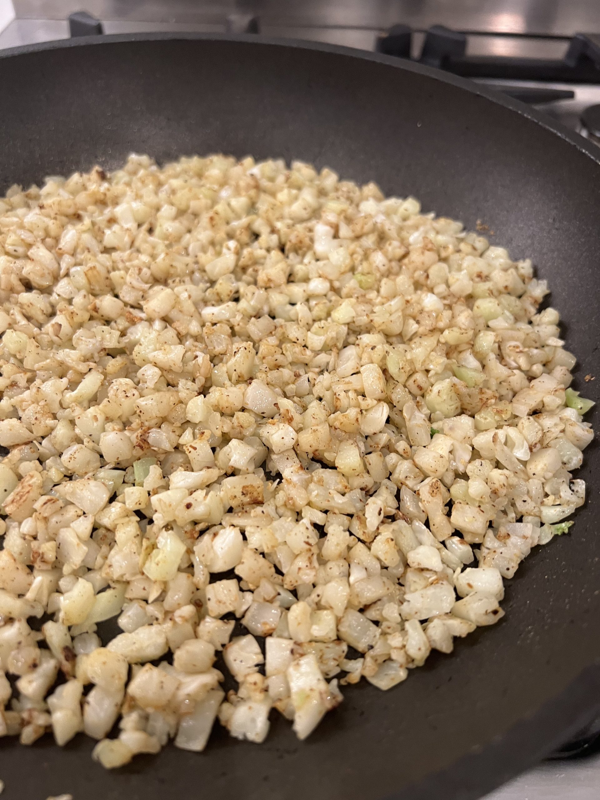 Meanwhile, make the cauliflower rice. Sauté for 5-7 min with a little olive oil and fajita seasoning.