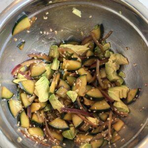 Add in your cucumbers, red onion, soy sauce, sesame oil, rice wine vinegar, and a squeeze of lime in a medium-sized bowl.