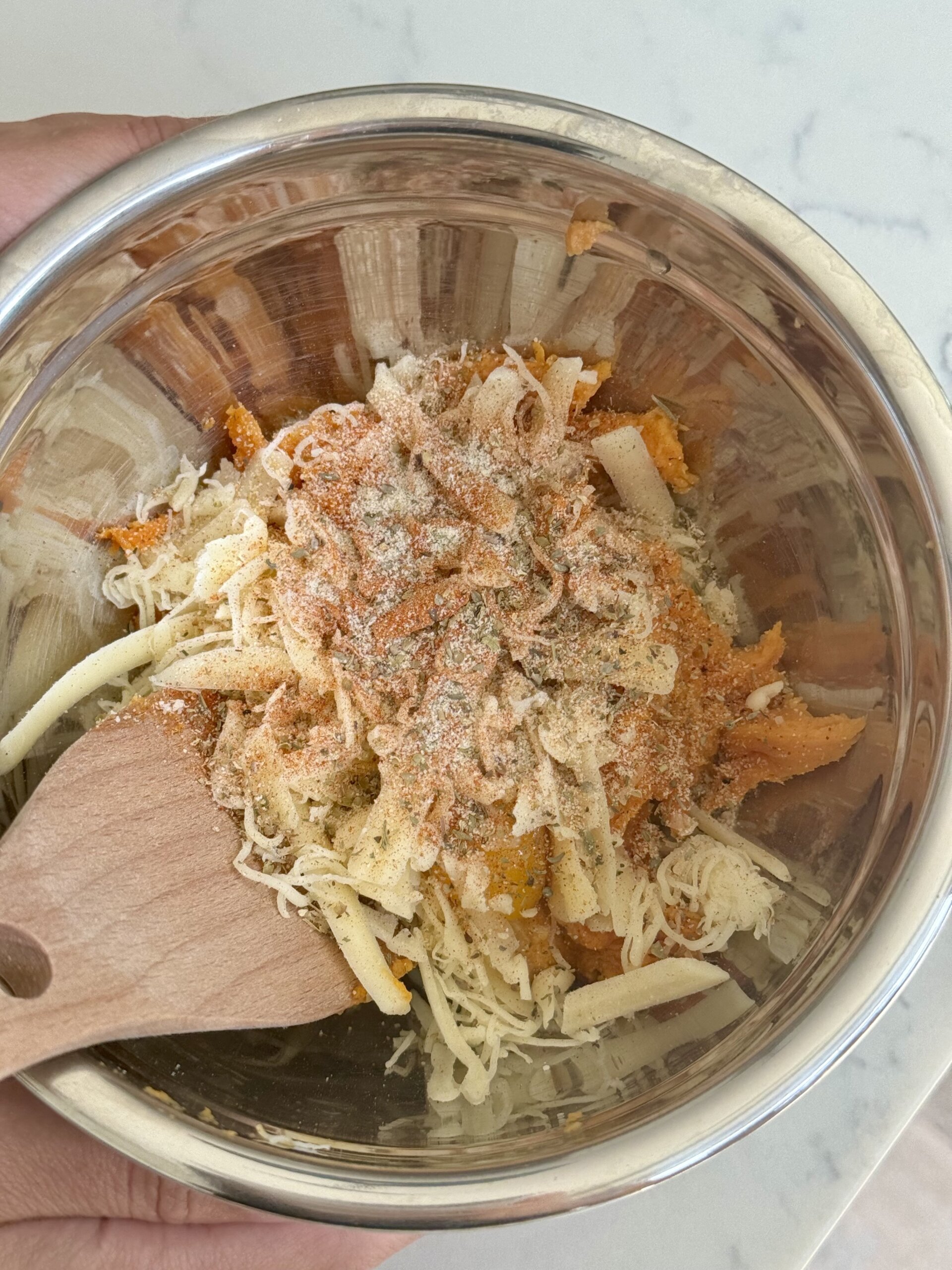 In the mixing bowl with the sweet potato, add shredded cheese, egg, garlic powder, onion powder, Italian seasoning, salt, and pepper. Mash together until well combined.