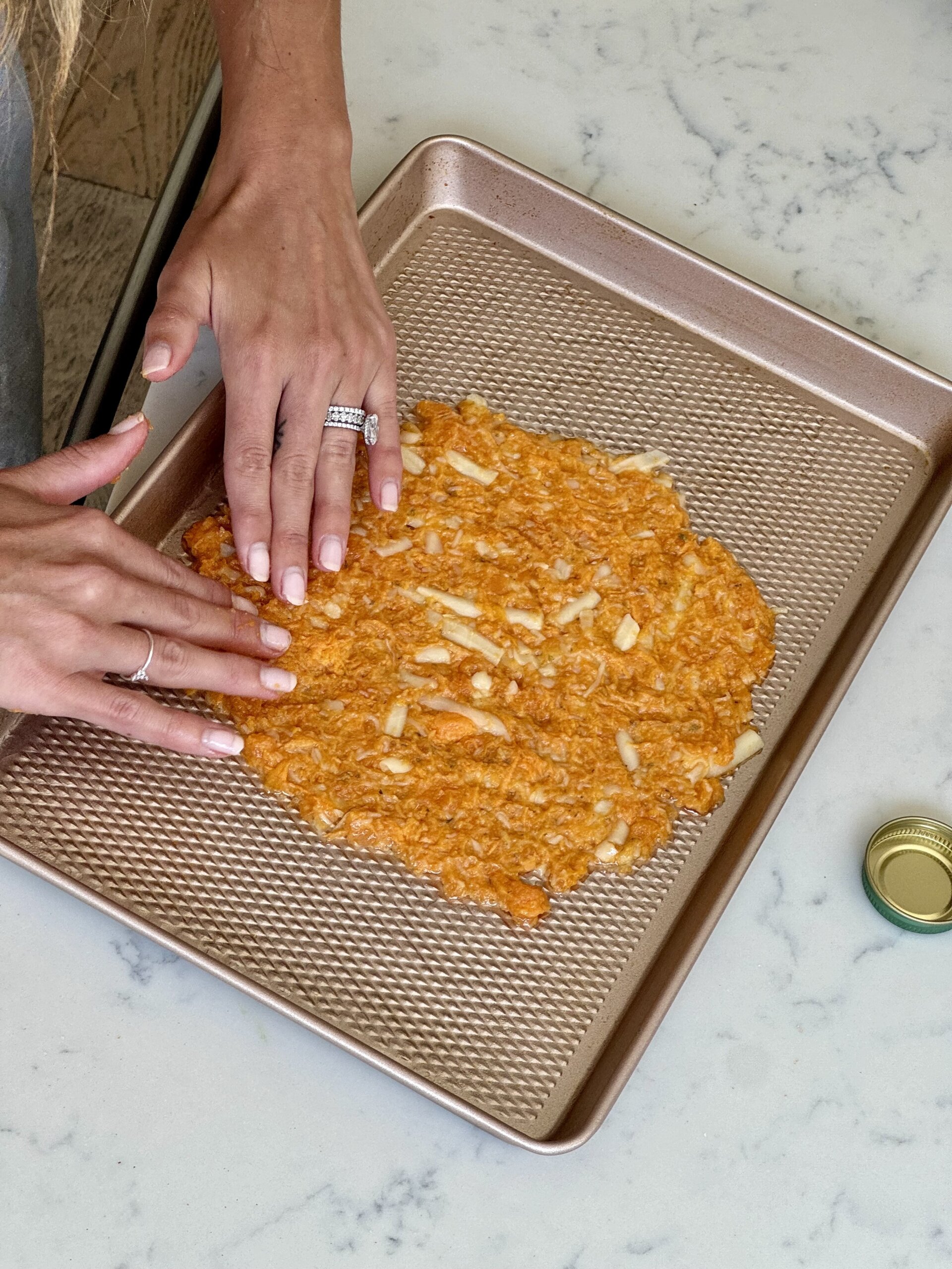Spread the dough mixture evenly on a pre-greased baking sheet or parchment paper.