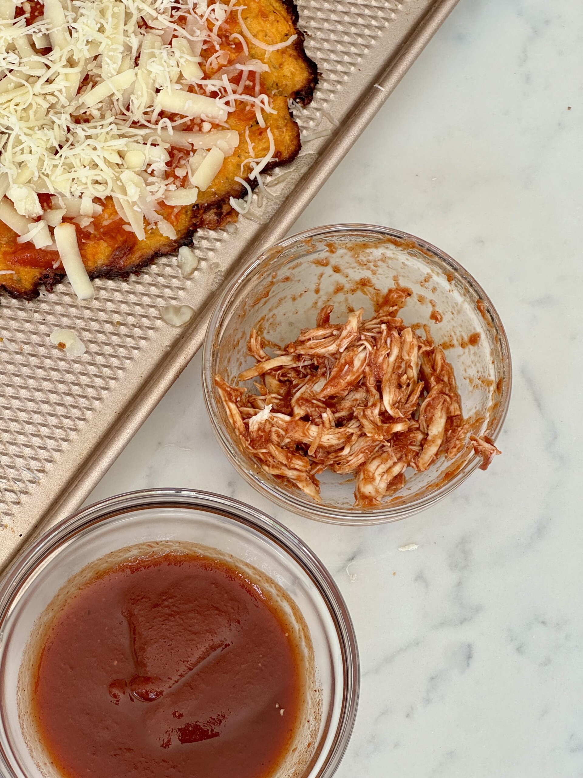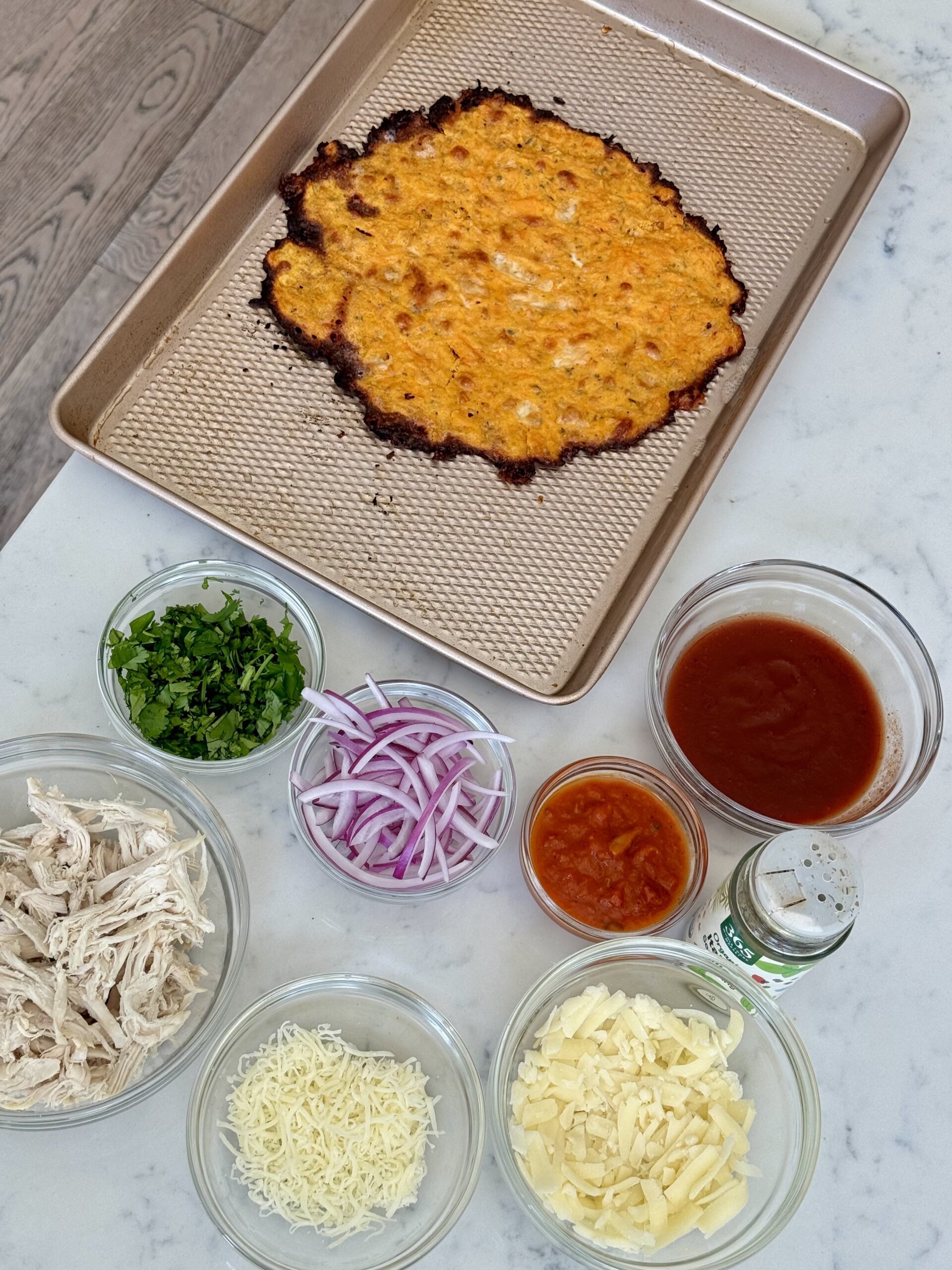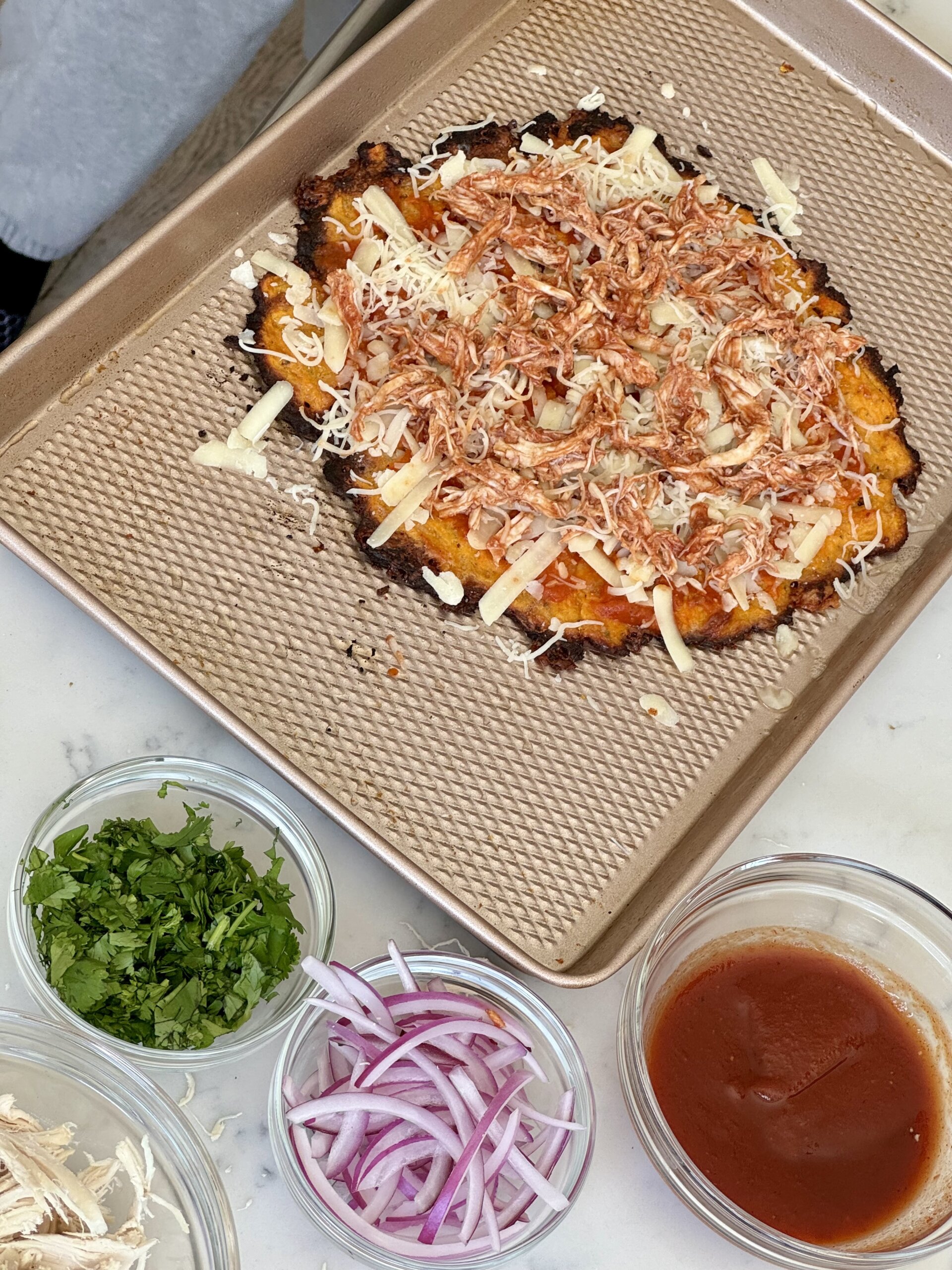 While the crust bakes, prepare your toppings by shredding the chicken and finely chopping the red onion and cilantro.