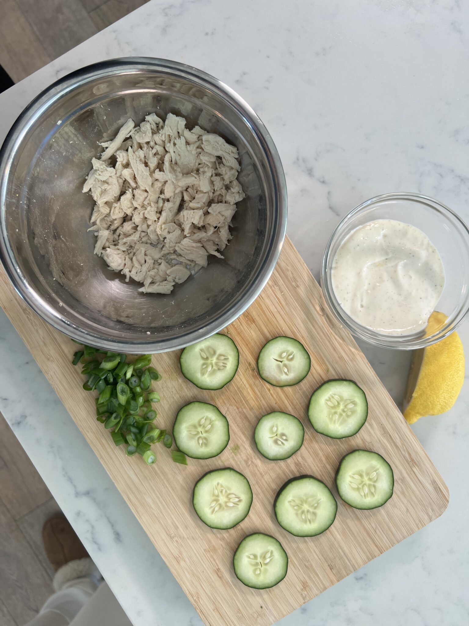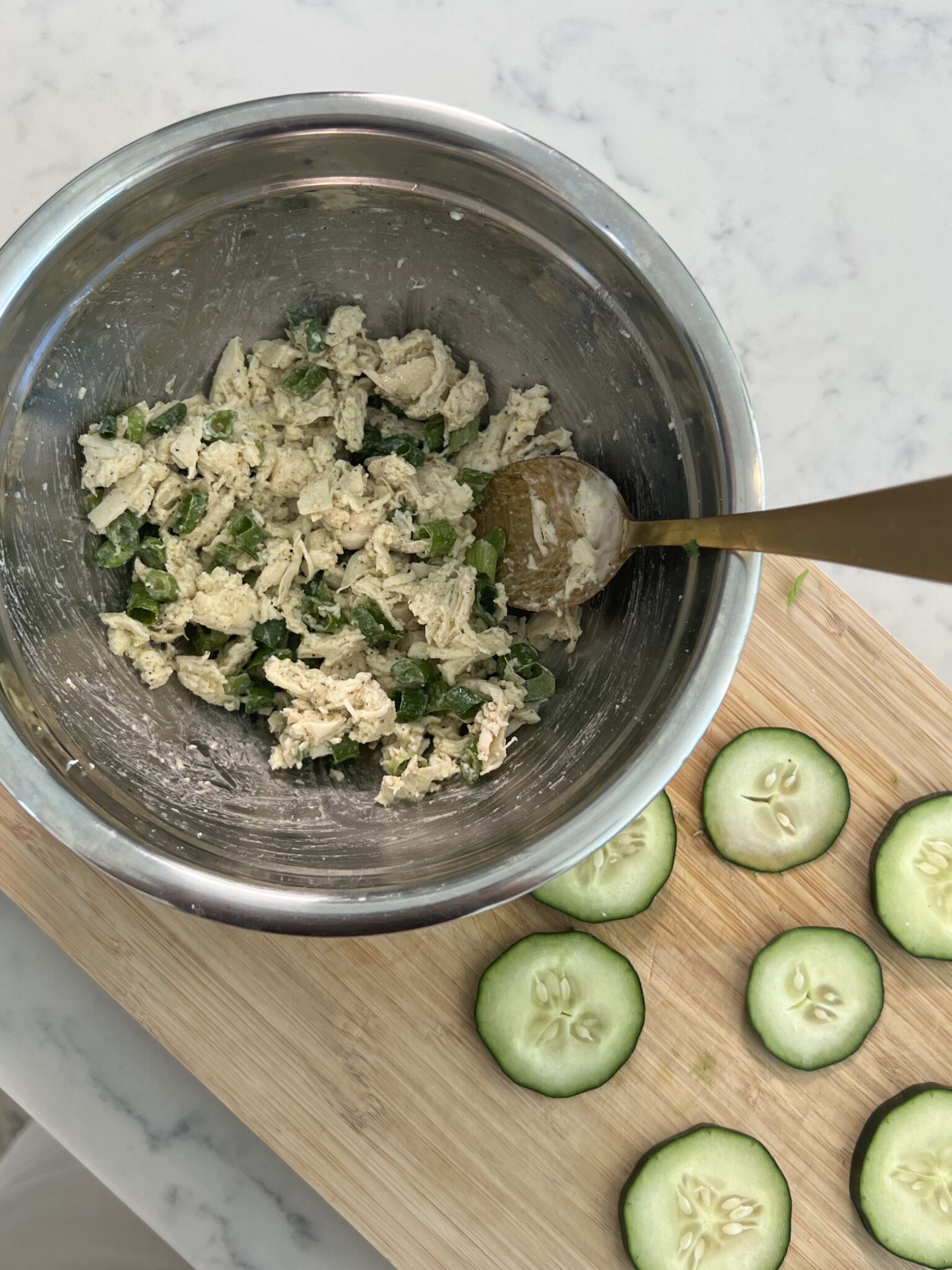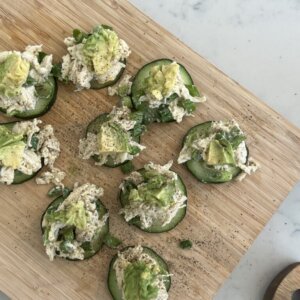 This recipe is the perfect "mini" meal or snack to make for a mid-day pick-me-up, girls' brunch, or luncheon. It's super simple and quick to make and super filling because of the protein!! Mixing cucumber with Caesar salad is honestly such a refreshing way to add in that crunch in a low carb way – the perfect bite every time!!