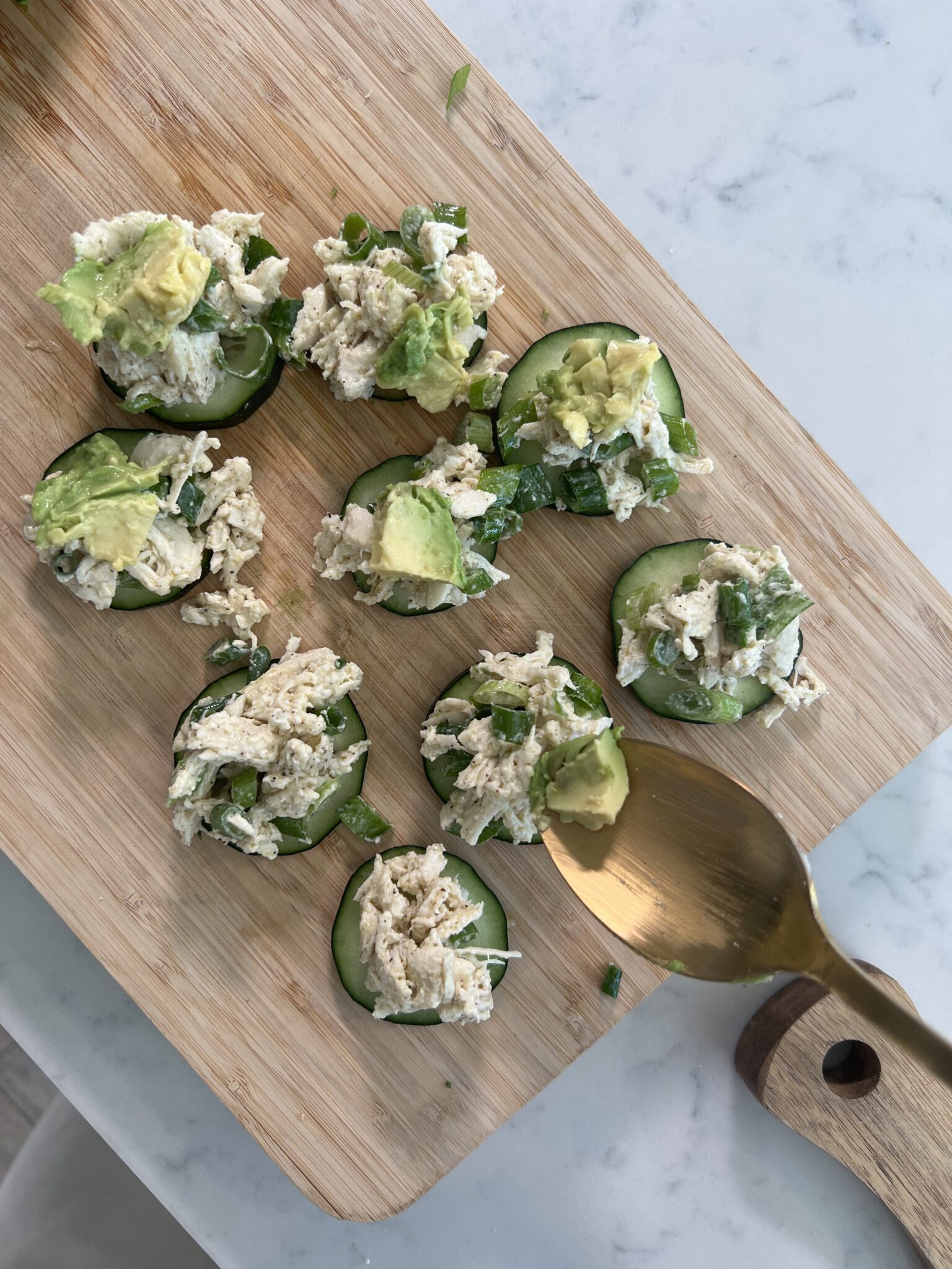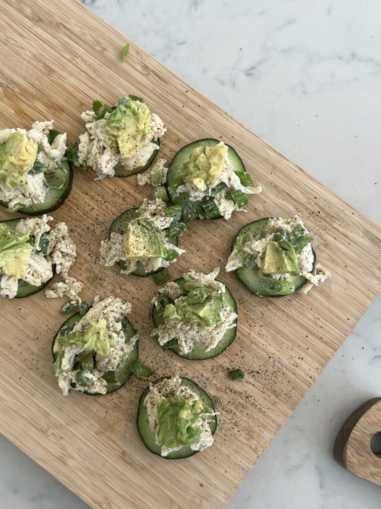 Top your cucumber rounds with even scoops of the chicken mix, and top with a small piece of avocado!