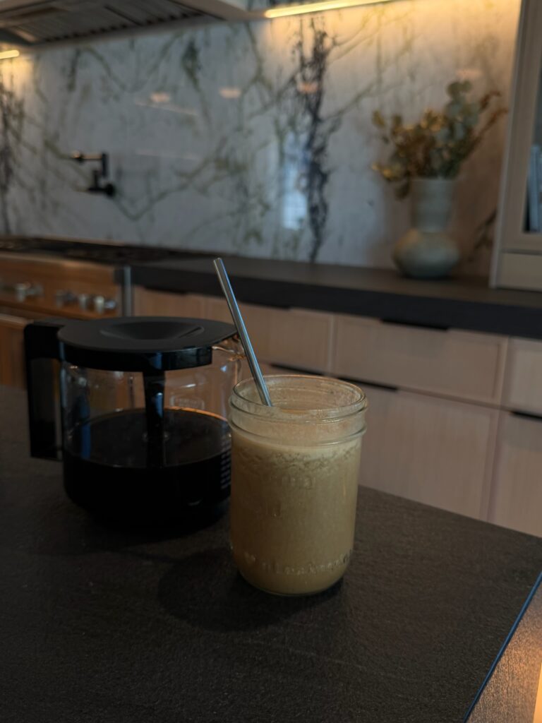 Add the coffee, ice, banana, nut butter, and vanilla protein powder into a blender.