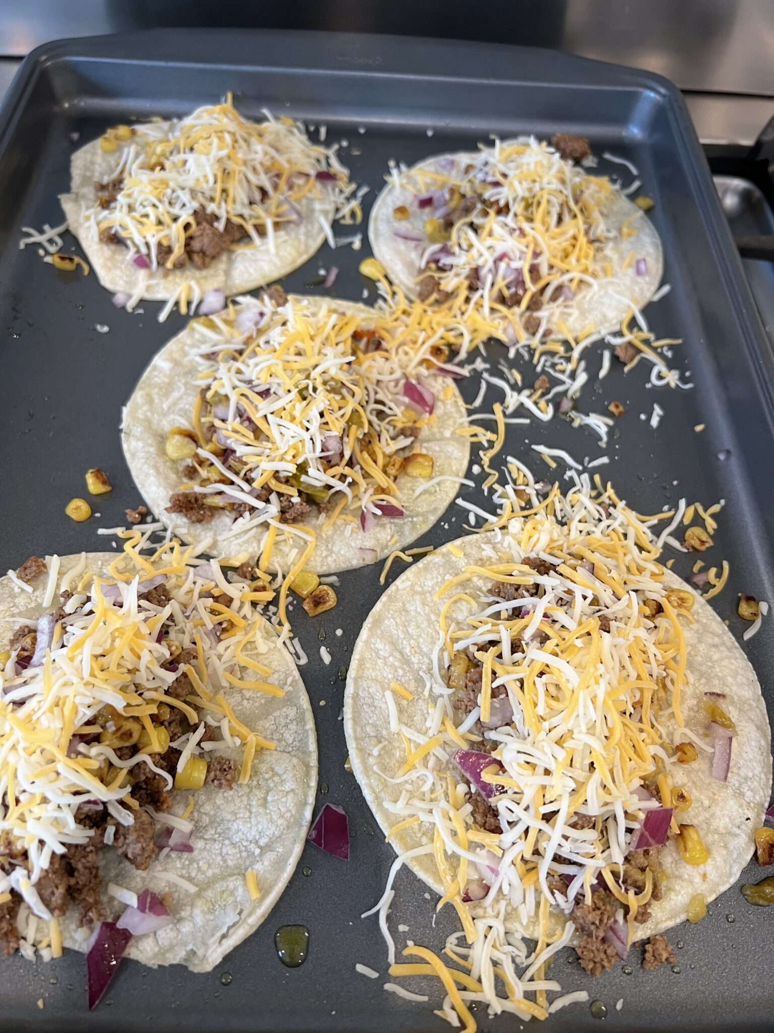 Put the tortillas covered with a little bit of olive oil on a baking tray, and add a little bit of your cooked ground beef to each tortilla.