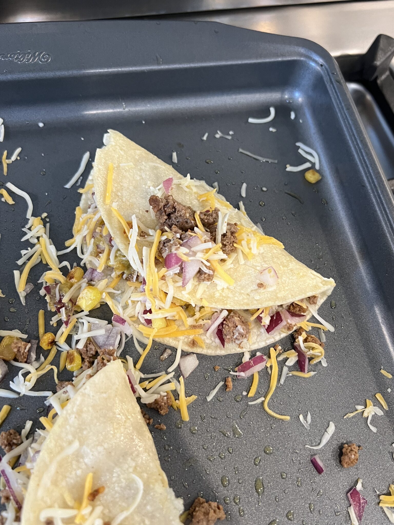 Add your charred corn, red onion, green chillies, and cheese! Fold over and place in the oven.
