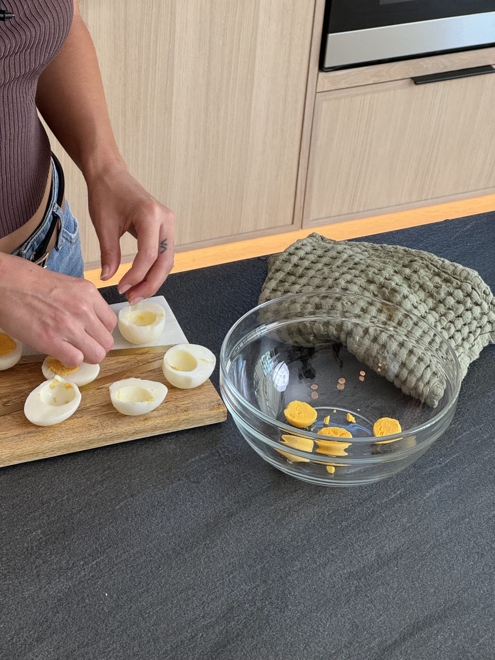 Peel the eggs and slice them in half lengthwise. Carefully remove the yolks and transfer them to a mixing bowl. Place the egg whites on a serving platter.