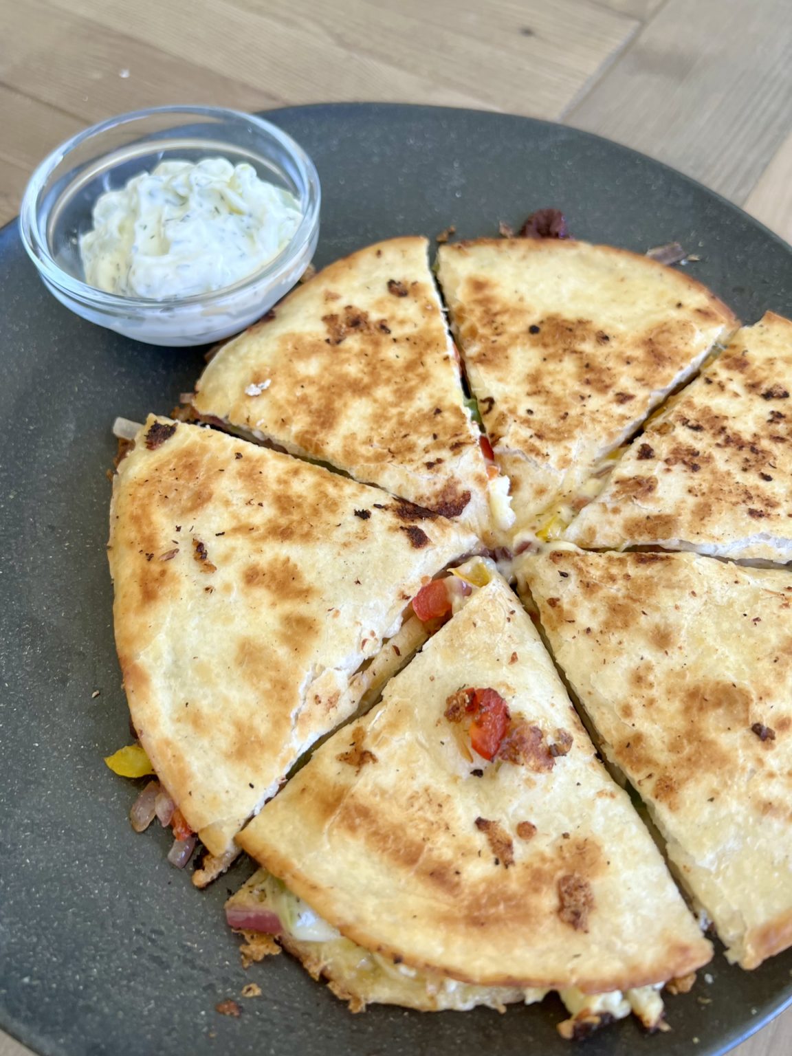 Get your sautéed veggies that you set aside, and sprinkle evenly on top of the cheese. Add more cheese then follow with your remaining tortilla.