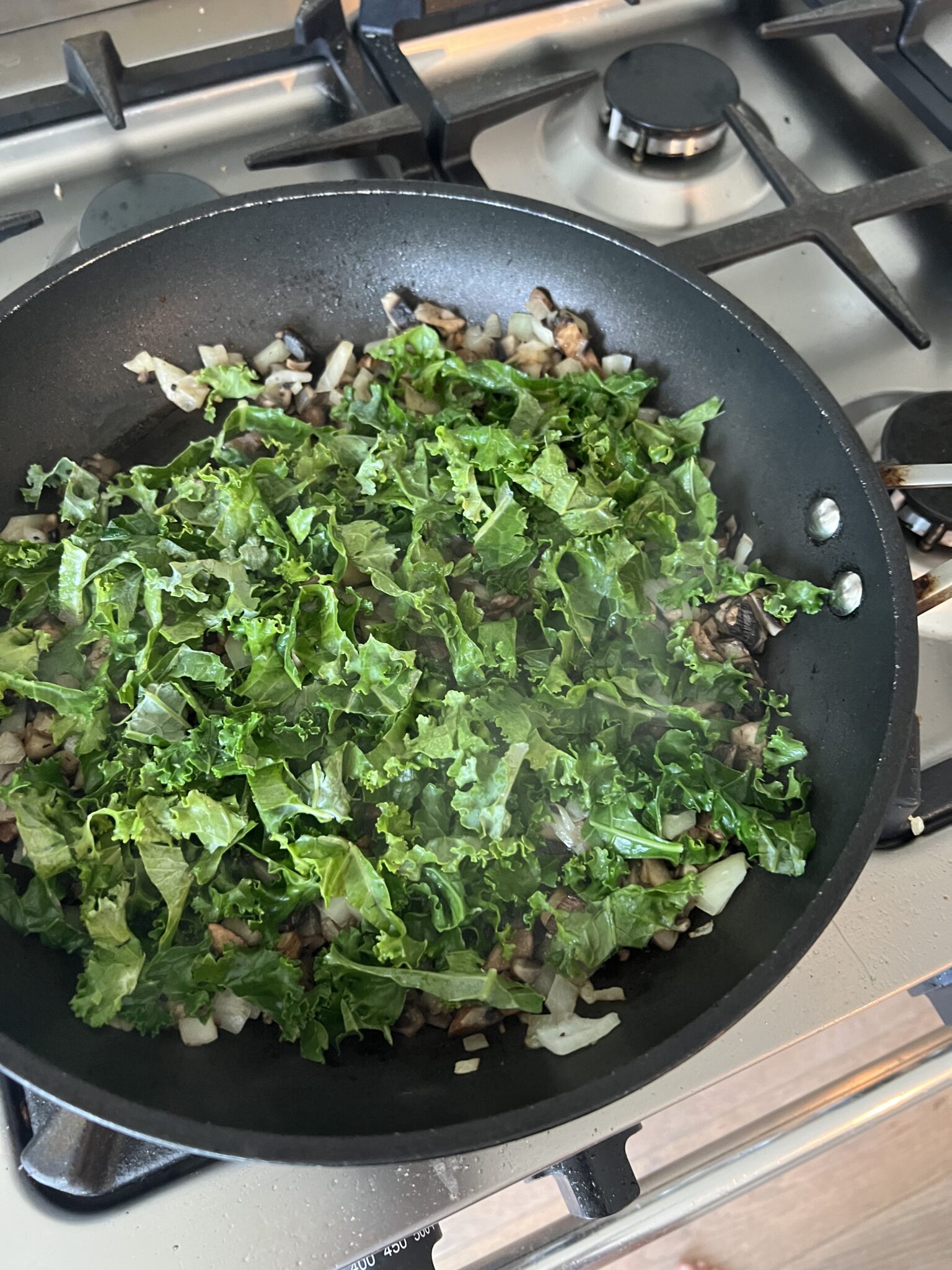 In a skillet on medium heat, saute your mushrooms and onion for about 4-5 minutes, then add in your kale, garlic and vageta.