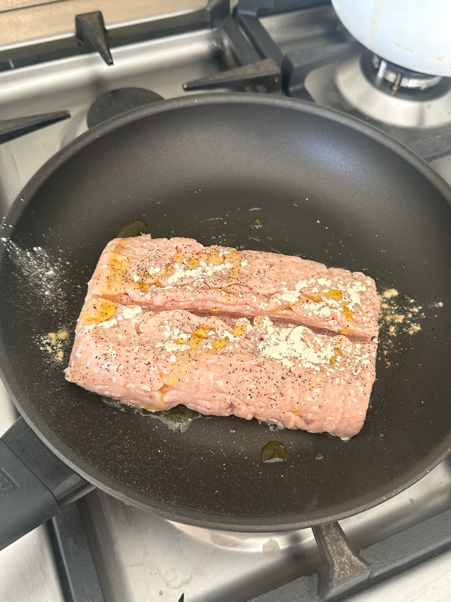 Heat a skillet over medium-high heat. Add a drizzle of olive oil, your ground chicken, garlic powder, onion powder, salt, and pepper.