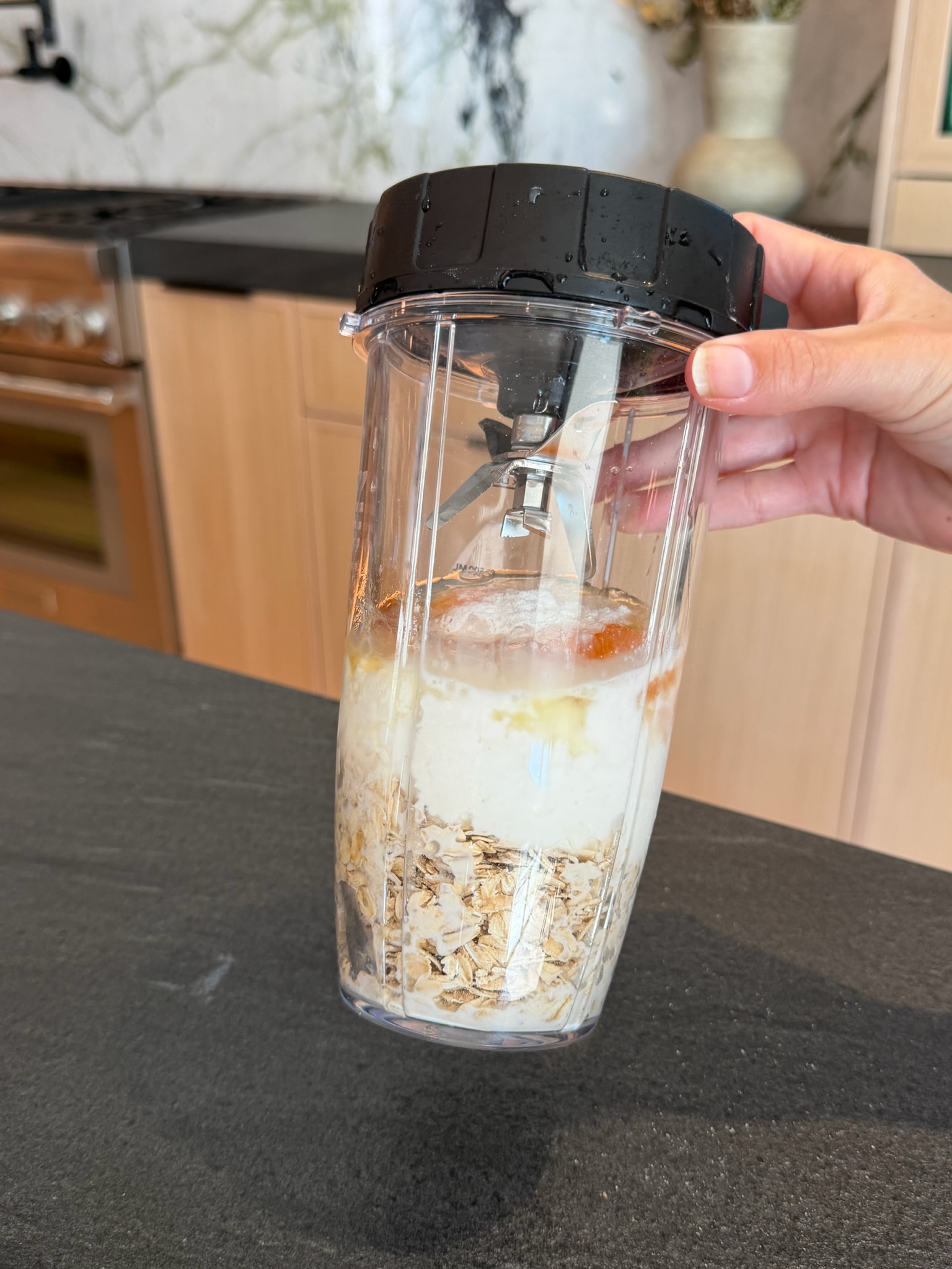 Add the rolled oats, cottage cheese, eggs, milk, baking powder, vanilla, and a pinch of salt to a blender. Blend until smooth and creamy.