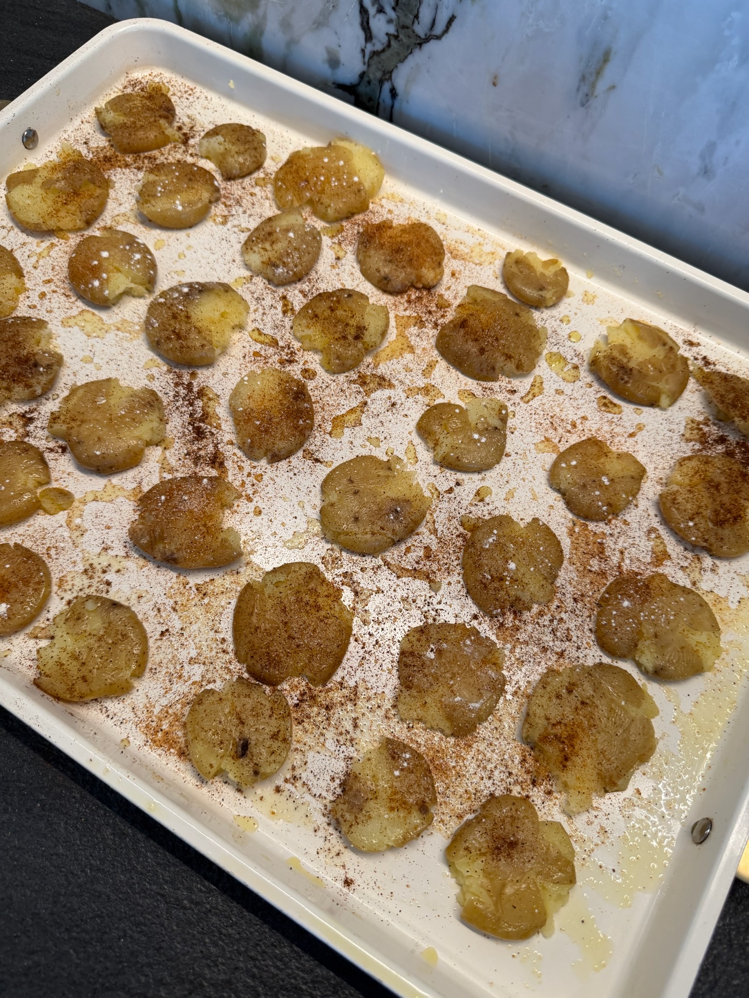 Take out a baking sheet and drizzle about a tablespoon of olive oil on the bottom. Put the potatoes on the baking sheet and smash each one using the bottom of a cup.