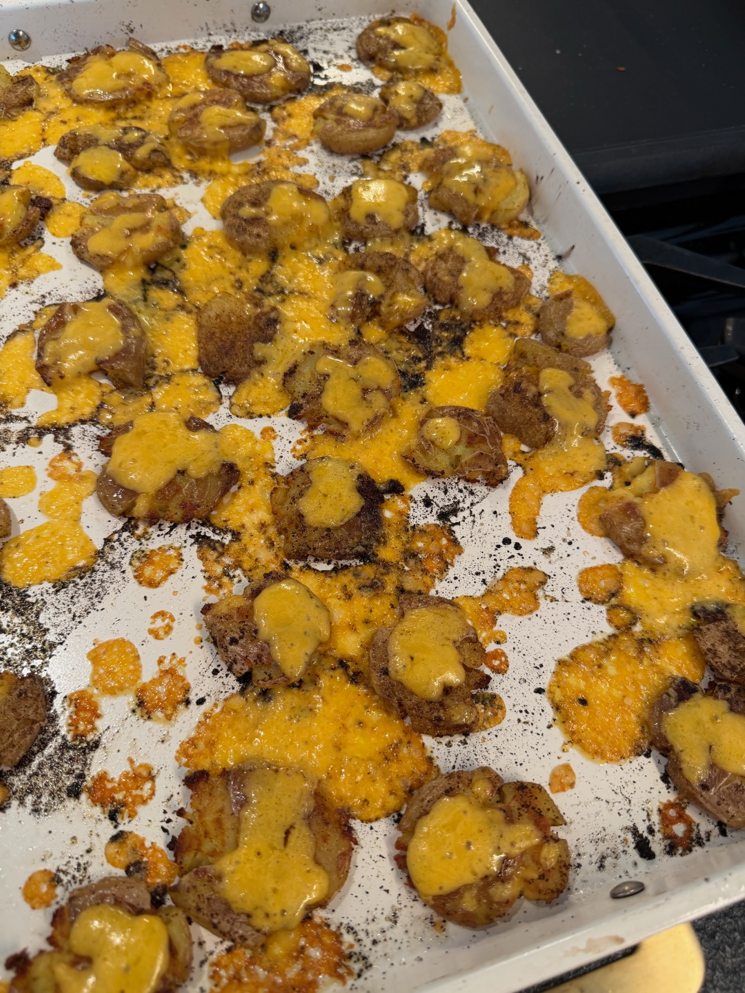 After the potatoes have baked for 20 minutes, add the shredded cheese on top and then bake again for three minutes until the cheese has melted over the potatoes.