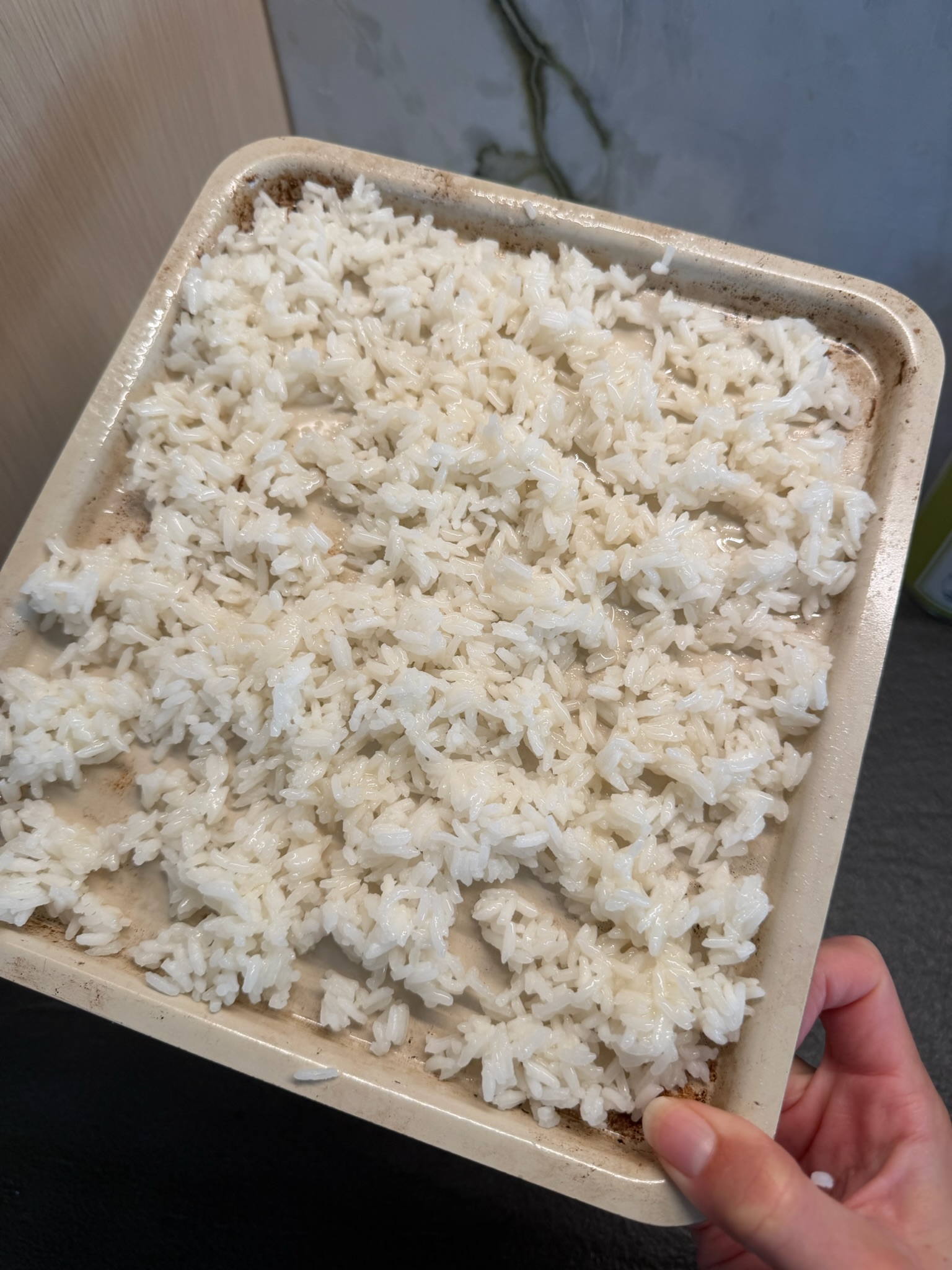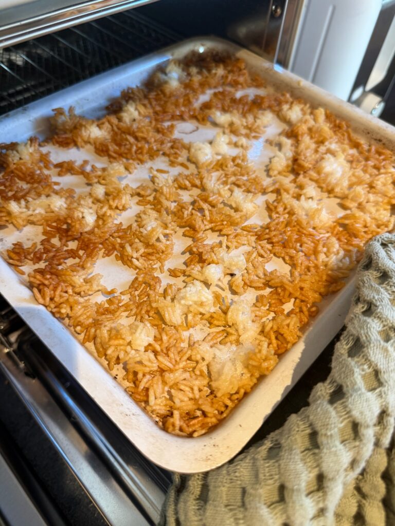 The rice should be completely cooled now, so toss it on a baking tray and spray lightly with a little oil of choice (I use avocado oil). You can airfry or bake the rice in the oven for about 20-25 mins at 425, or until the rice is toasty.
