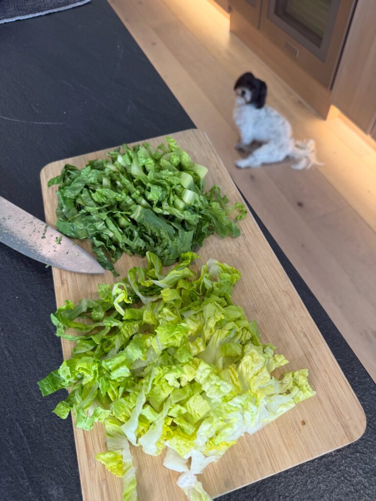 Finally, prep your salad base: wash, dry, and chop up romaine into a big salad bowl.