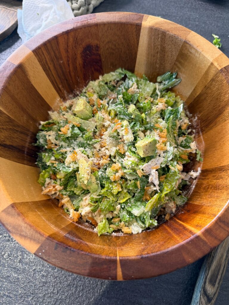 Dice an avocado into the romaine. Add in your chicken, crispy rice, & grated parmesan directly into the salad.
