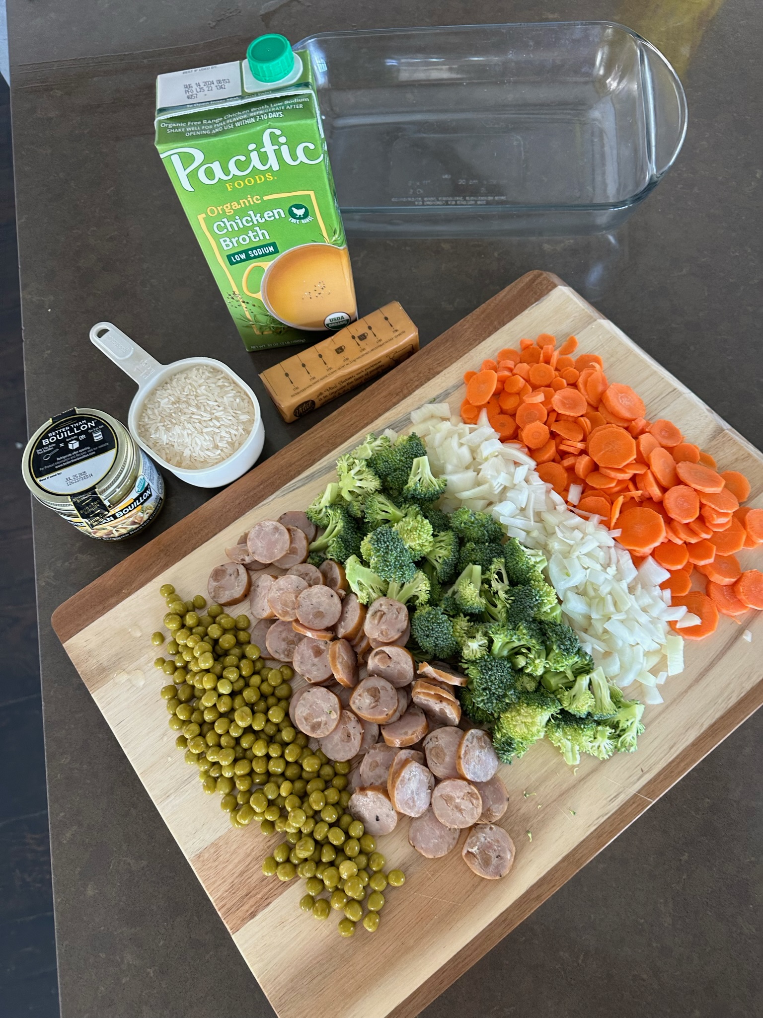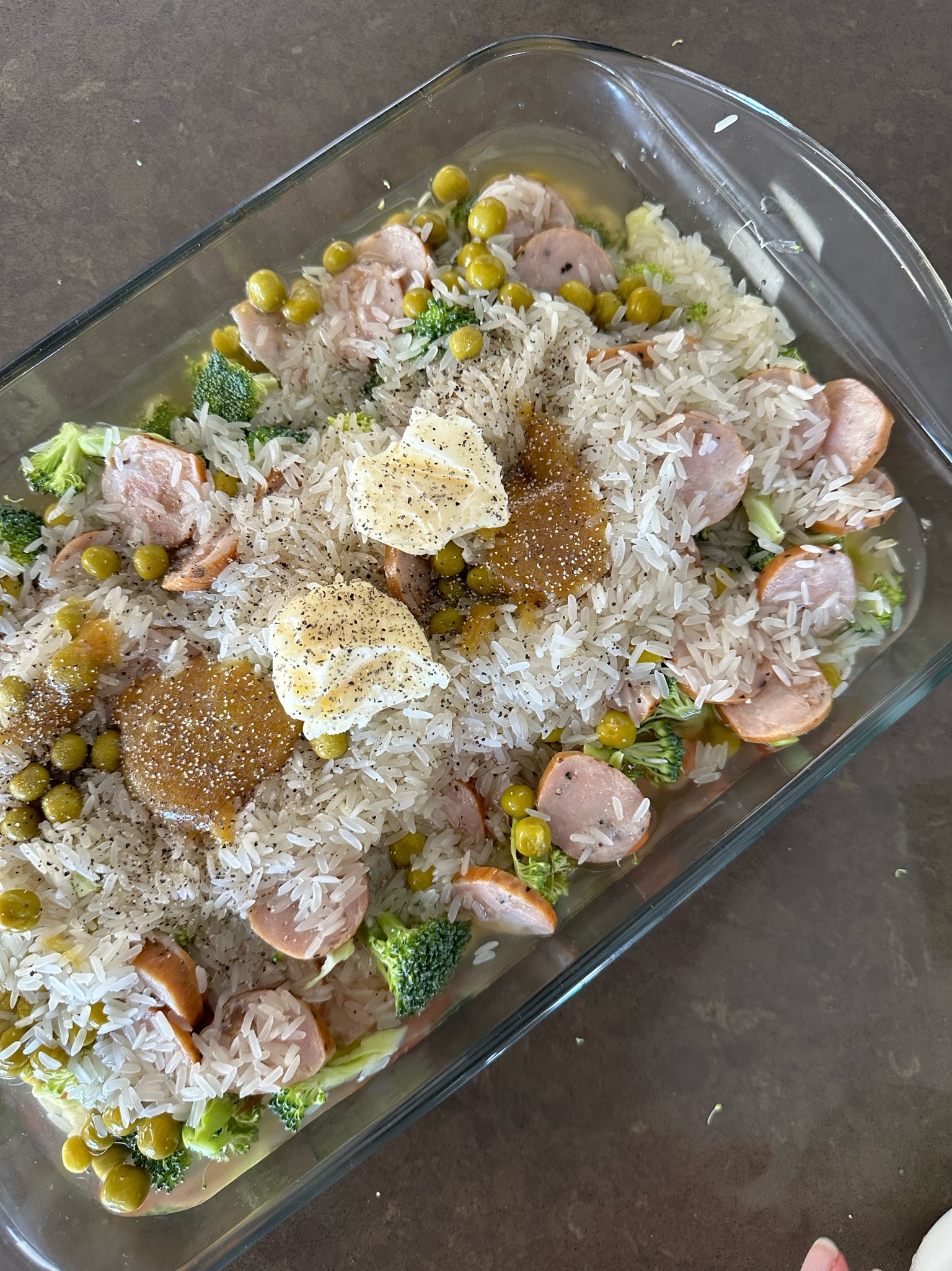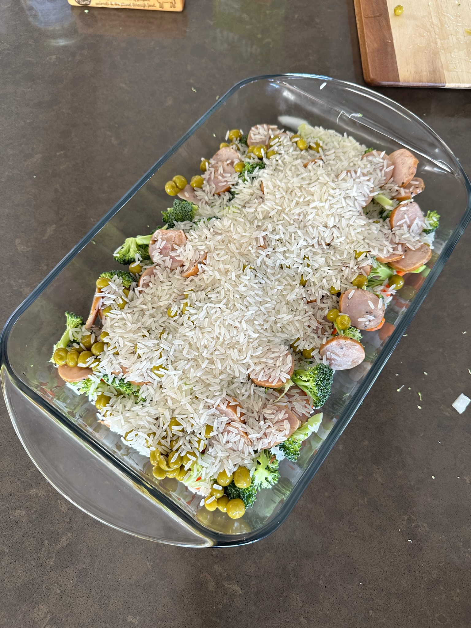 Arrange the prepped ingredients in a baking dish, layering with rice on top. Pour in your water or broth, and add butter, bouillon, and seasonings.