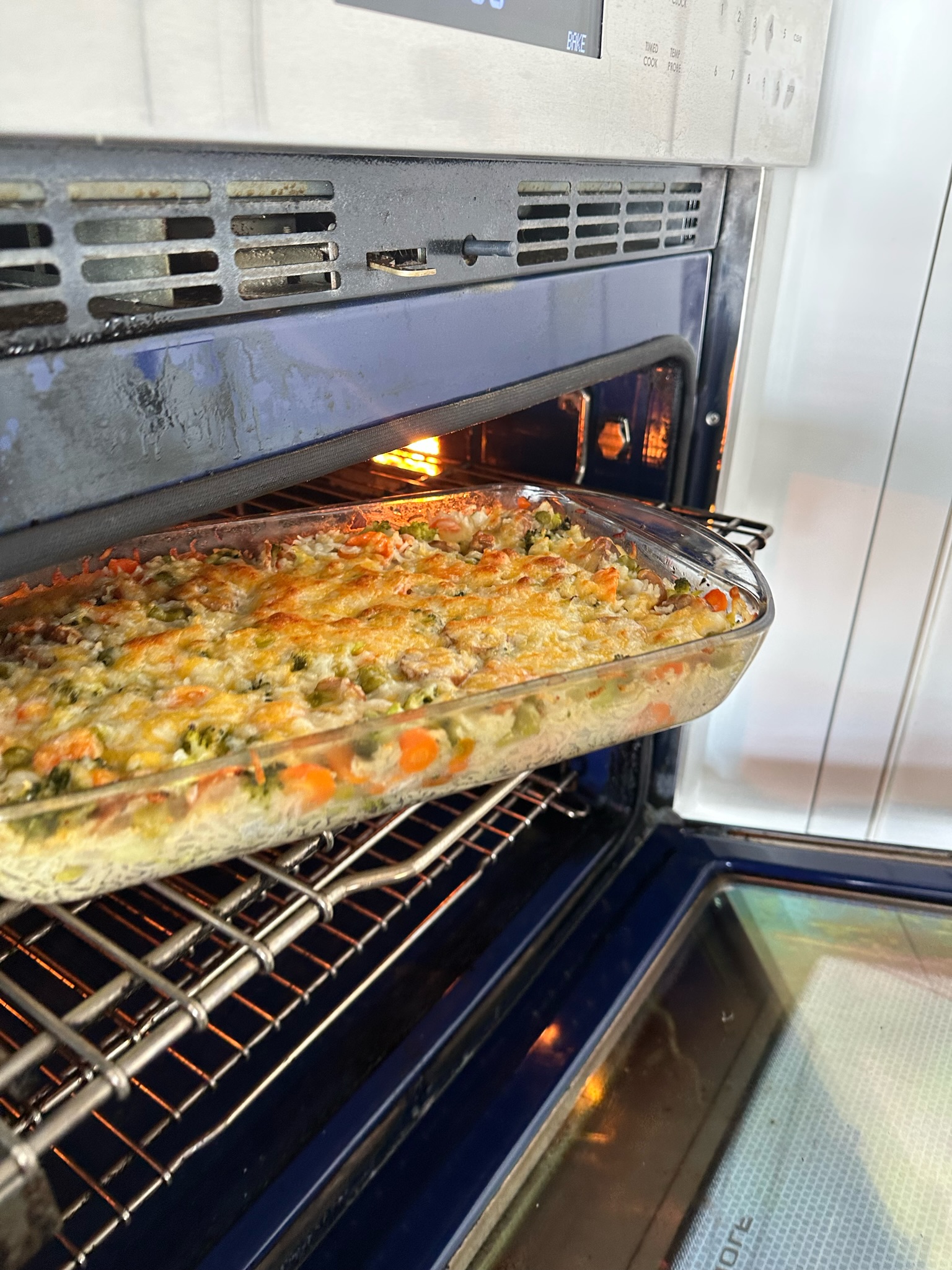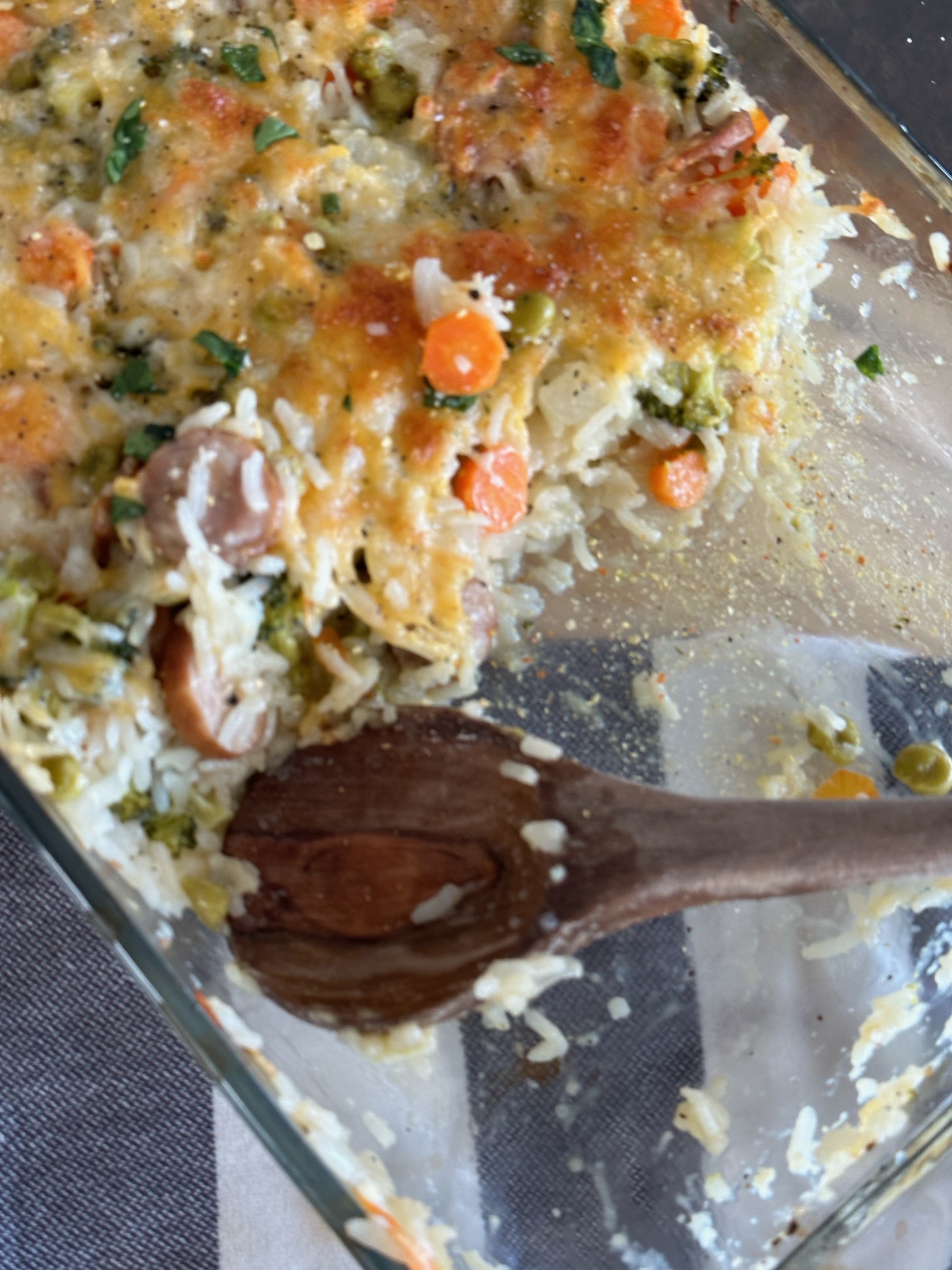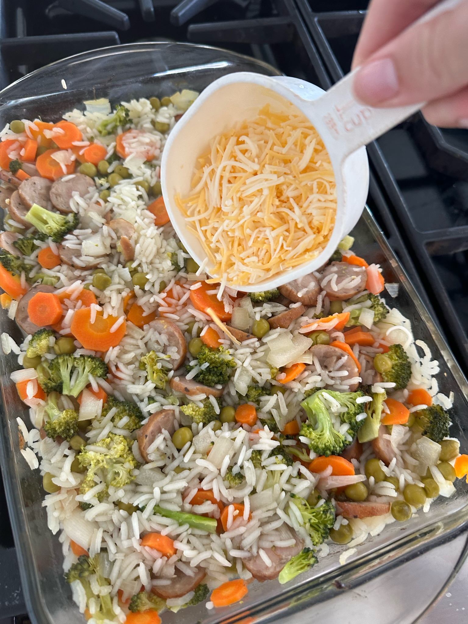Arrange the prepped ingredients in a baking dish, layering with rice on top. Pour in your water or broth, and add butter, bouillon, and seasonings.