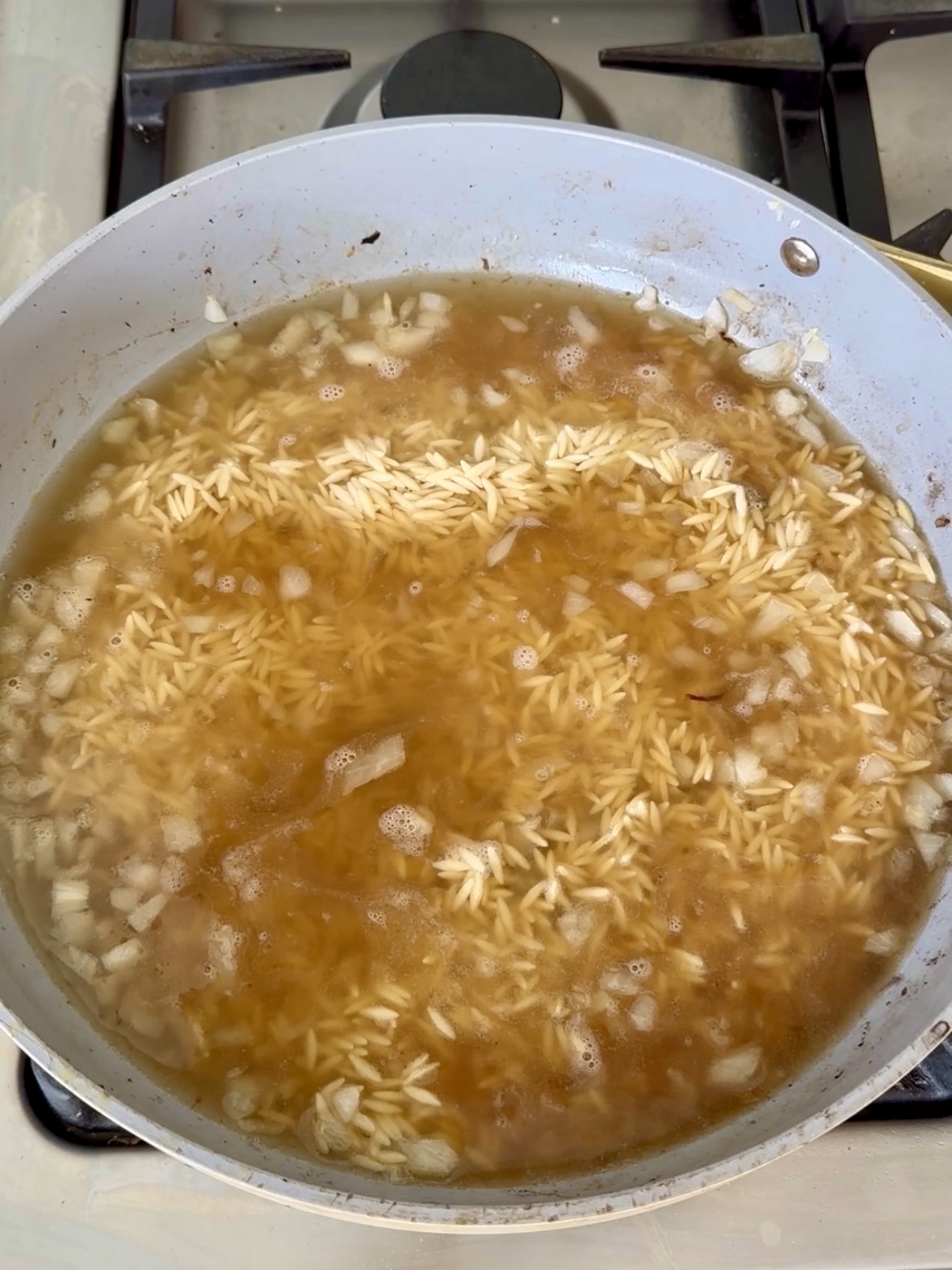 Add your orzo to the pan then add your chicken stock. Once you introduce the chicken stock to the pan, stir well to combine. Cover the skillet with a lid and let it simmer, stirring occasionally, allowing the orzo to reach an almost cooked-through consistency.