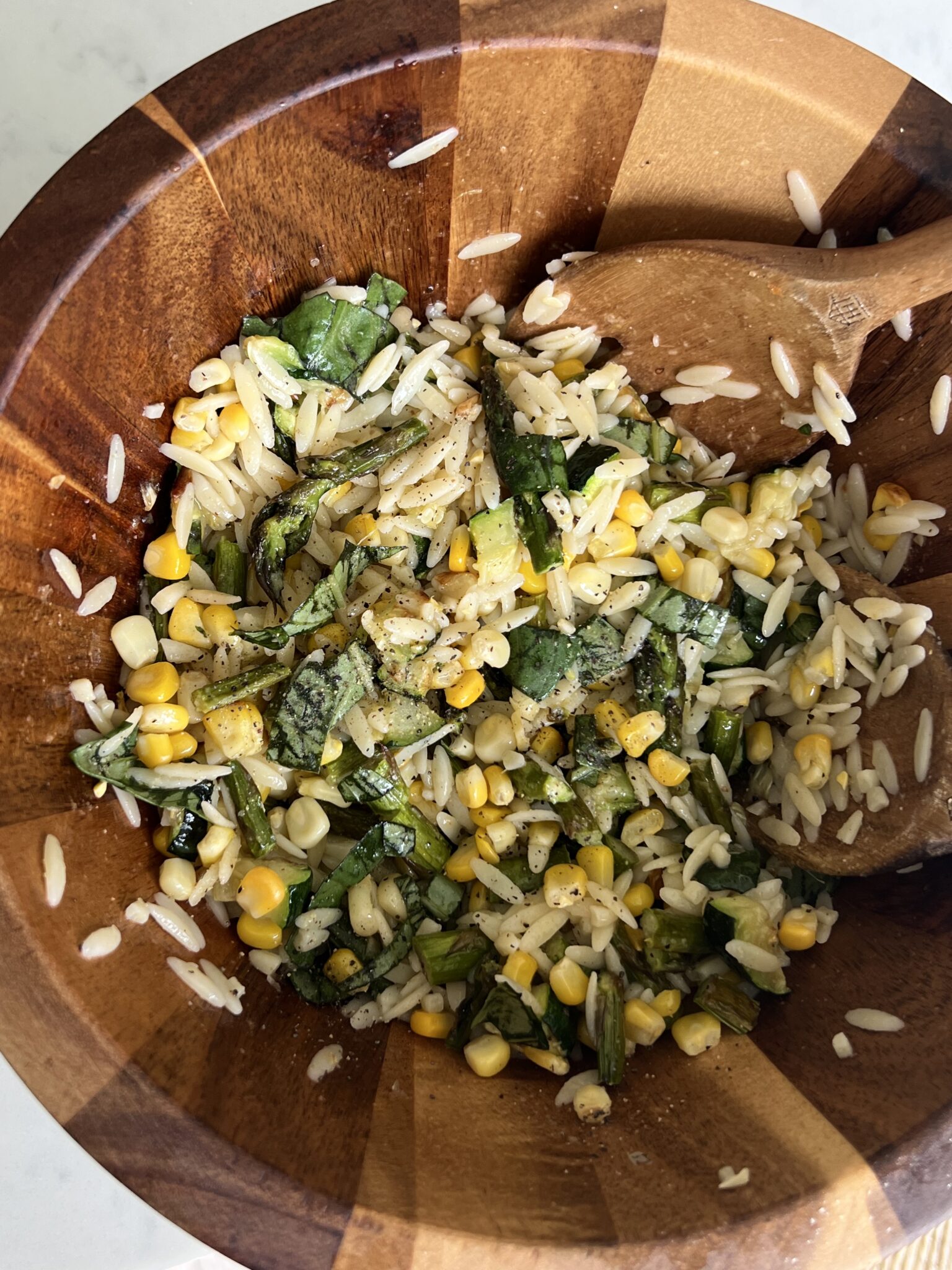 Now, it’s time to assemble! In a large bowl, add your orzo (can be cooled or warm depending on your preference), corn, zucchini, asparagus, and basil. Dress with a olive oil, red wine vinegar, and lemon juice.