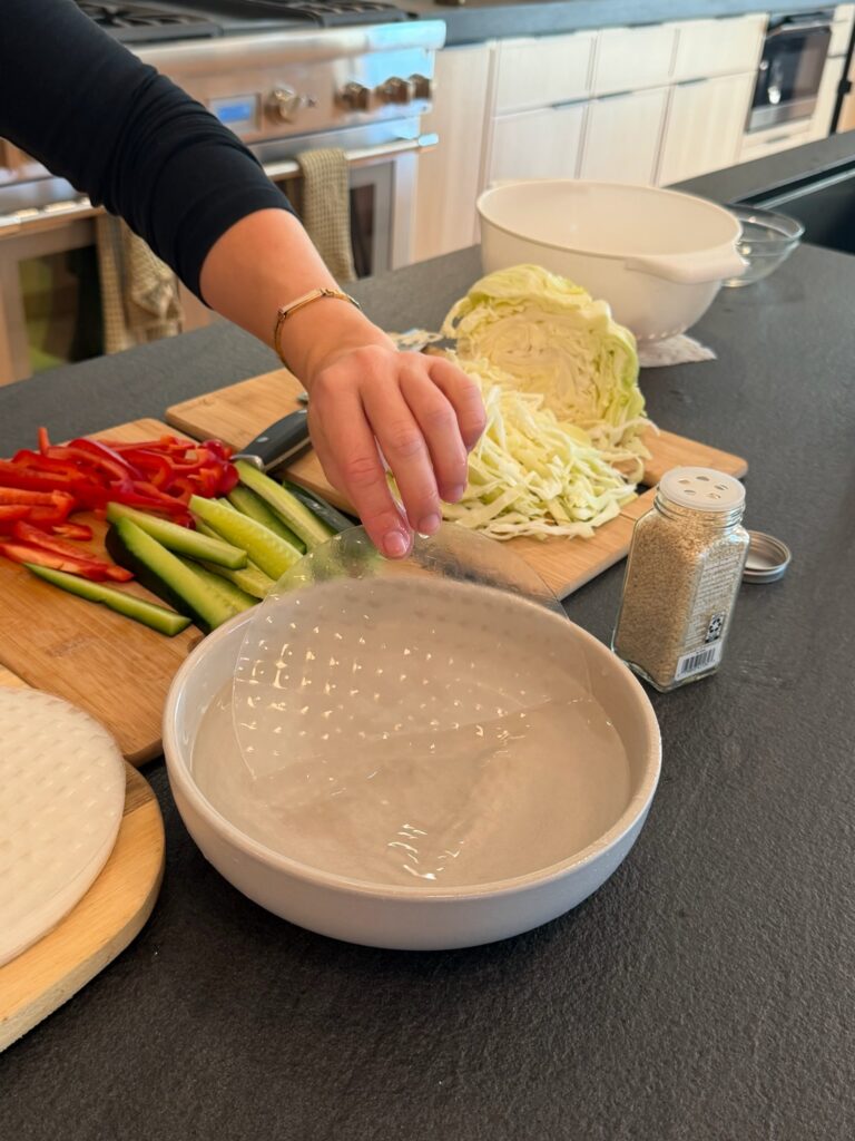 Now we build the spring rolls! For each roll, submerge rice paper for 7-10 seconds on each side in a bowl of water.