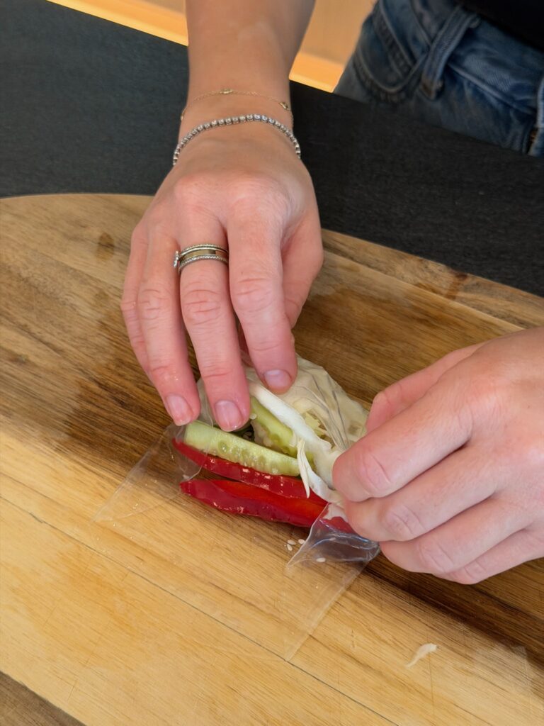 Add a little bit of your veggies, like the pepper, cucumber and cabbage. Enough to fill the roll, but not too much so it’s hard to pack it! It might take you a practice round to perfect it.
