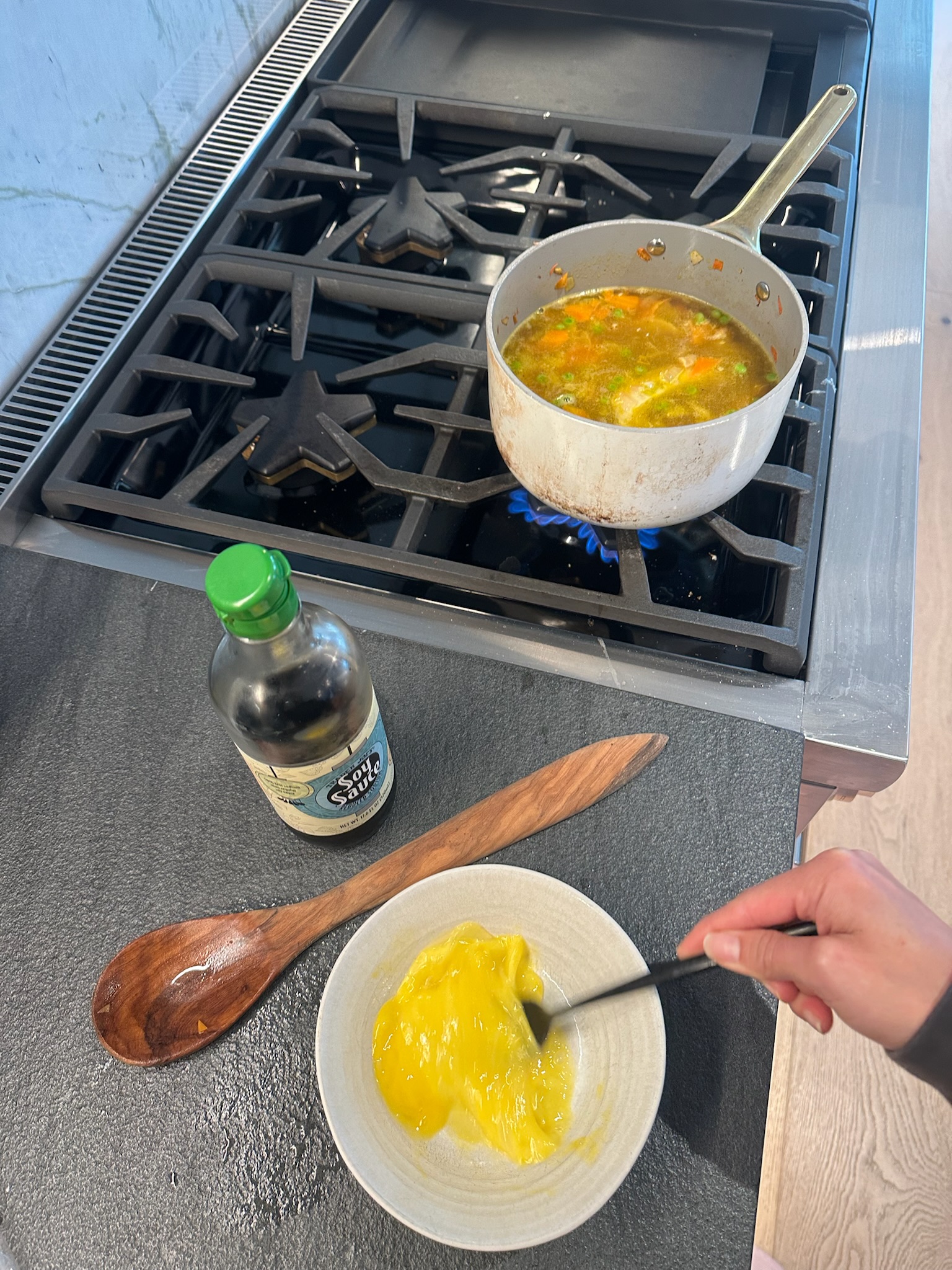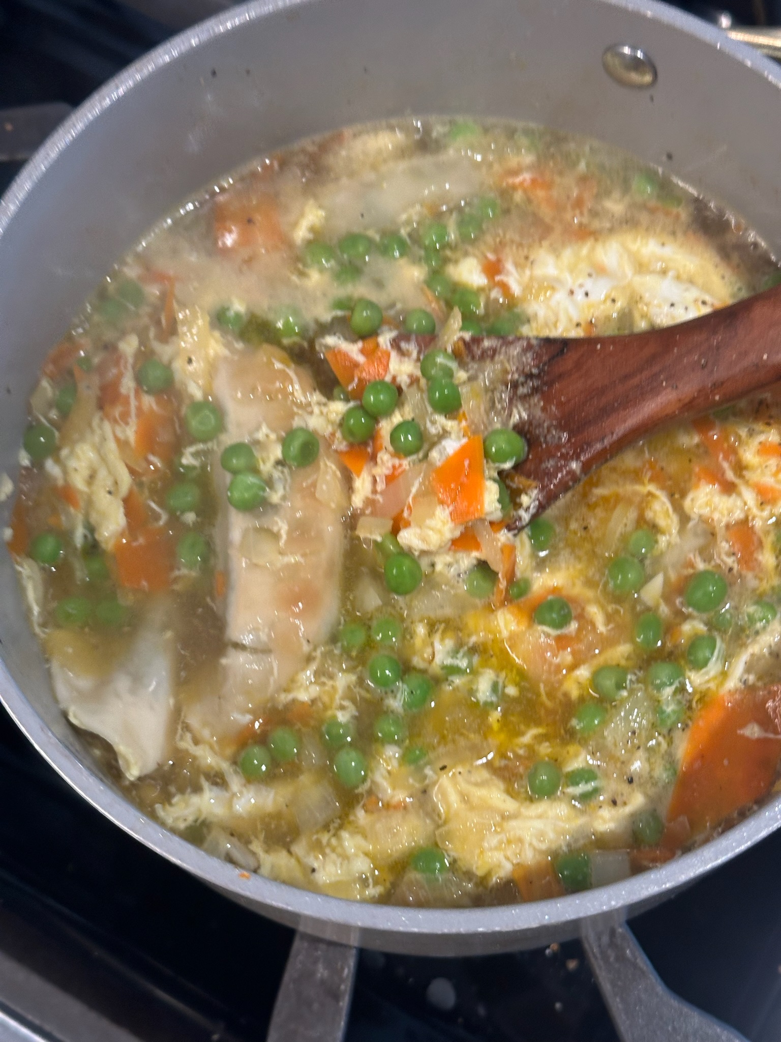 If you choose to use, stir in your spinach. Slowly drizzle in the whisked egg while stirring to create delicate egg ribbons.