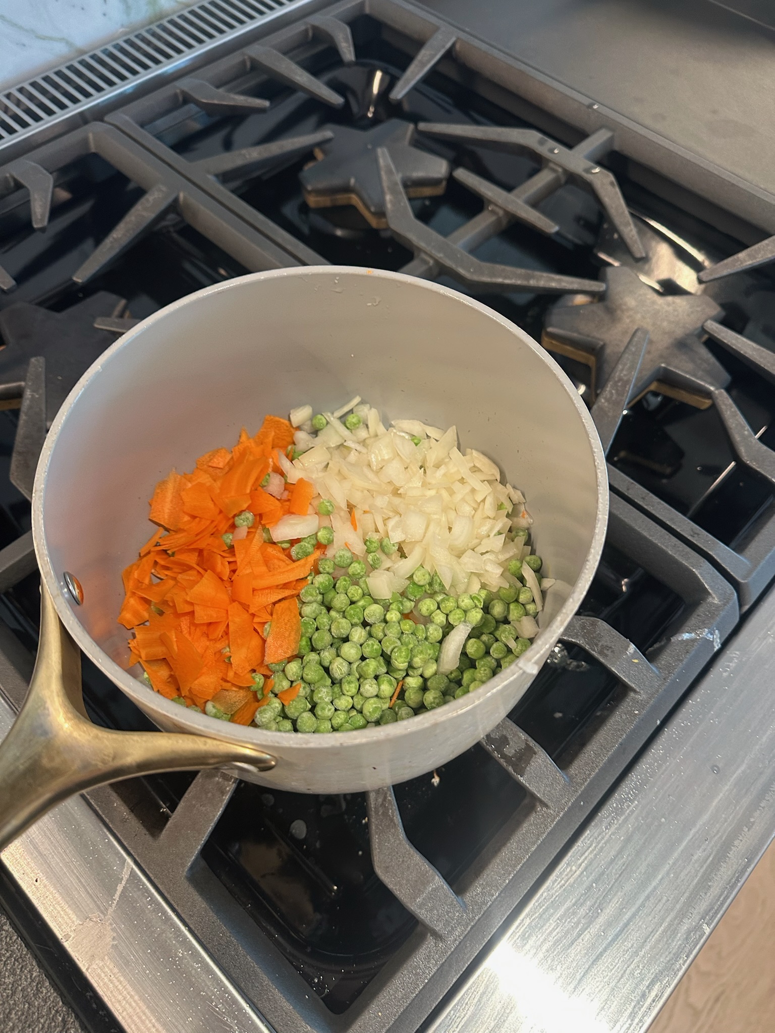 In a large pot over medium heat, warm the olive oil or butter. Add onion, carrots, peas, garlic, and optional ginger. Sauté for 2-3 minutes until fragrant.